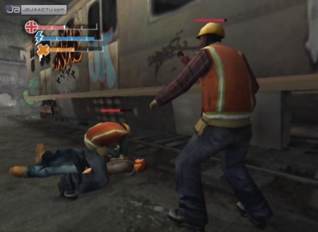 Il faut absolument couper court à cette comparaison avec GTA. Entendons nous bien, si les deux titres promeuvent la culture urbaine et une certaine liberté d'action, leur similitude s'arrête là. Ainsi, Getting Up s'architecture autour de plusieurs niveaux. Tombant sous le coup de la linéarité, le champ d'action est nettement plus restreint que celui d'une ville et on aura parfois la frustration de se cogner contre les fameux murs invisibles. D'un autre côté, il s'agit d'un mal pour un bien puisque cette orientation a permis de renforcer le caractère immersif du jeu. En effet, les développeurs ont accompli un énorme travail d'ambiance. Le level design est somme toute plutôt bon, les personnages sont charismatiques et la progression du jeu s'accompagne d'une bande sonore qui déchire. Wesh ! Pour ainsi dire, le doublage est particulièrement convaincant et la play-list accueille de grands noms de la scène hip hop. On pourra même écouter les pistes de son choix via l'intermédiaire de son iPod et débloquer de nouveaux tubes durant la partie. Par ailleurs, les menus sont très soignés et les différentes œuvres dans le jeu le sont tout aussi sympathiques. Rien à redire non plus du côté des animations des personnages (si ce n'est peut-être que Trane saute comme un pingouin asthmatique). Seulement, la réalisation pêche un petit peu lors de certaines occasions. Sujet à quelques ralentissements sur PS2,