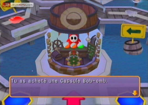 Au menu des désagréments, notons qu'il n'est toujours pas possible d'accélérer le mouvement lorsque c'est au tour du CPU de lancer le dé. Même si les cut-scenes intermédiaires et les duels en pilotage automatique sont désormais zappables, cette impression de dormir devant l'écran qui perdure depuis plus de cinq ans est agaçante. Avec un peu de chance, nous aurons droit à cette fonction sur la Revolution. Du coté des graphismes, il serait peut-être temps de faire également quelque chose même si ce n'est pas l'élément-clé dans ce type de jeu. Couleurs pas terribles, textures quasi inexistantes, background peint à l'arraché, tout y est. Le character design continue d'être fidèle à lui-même, à savoir médiocre. Lorsque l'on voit Mario Power Tennis qui évolue pourtant dans le même ton rose-bonbon de Mario Party 6... Concernant l'ambiance sonore, encore une fois c'est le désert. Des bips par ci, des ricanements par là, rien de bien solide à se mettre sous la dent. Les mélodies sont archi-connues puisqu'elles reprennent toutes les samples de l'univers Mario. Normal, c'est un Mario Party ! Les machines à capsules, quant à elles, ont disparu du paysage pour laisser place aux magasins qui font ainsi leur grand retour. Comme dans les Mario Party précédents, il est possible de déplacer l'étoile d'un coup de Tweester, agresser les concurrents avec des Chain Chomps enragés, ou envoyer des carapaces piquantes dans les fesses. Chaque personnage peut porter sur le dos trois capsules. Si l'occasion d'en saisir une quatrième se présente, il est possible de s'en débarrasser d'une sur le chemin; ce qui est mieux d'en avaler de force pour faire de la place.