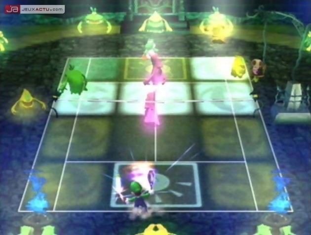 Pour ceux qui en avaient ras la casquette du trop de sérieux des Top Spin et Cie, Mario Power Tennis s'avère être un excellent remède. Chez Nintendo, c'est le délire qui prime. On ne se tape pas autant de barres qu'avec un bon coffret des Inconnus offert à Noël, mais ça change tout de même le paysage. Que ce soit en single player ou en multijoueur, les coups tordus sont au rendez-vous. Hormis les traditionnels courts auxquels on a droit lorsque l'on regarde le tennis sur les chaînes sportives - terre battue, gazon et surface rapide - il existe également d'autres terrains spéciaux dans le mode Gimmick Match. Lorsque l'on y débarque pour la première fois, c'est la totale ! Des Lacoste qui viennent grignoter les doigts de pieds, des fantômes qui glissent des peaux de banane sous les souliers, des courts qui s'agrandissent ou se rétrécissent selon l'impact de la balle... Autant vous le dire tout de suite, on se sent un peu perdu au départ. Mais une fois le principe saisi, on essaie tant bien que mal à rester debout sur ses jambes. Mention spéciale pour le Wario Factory Court qui va en énerver plus d'un. Explications : le terrain est divisé en plusieurs parties roulantes, et des flèches indiquant des directions différentes se situent juste au-dessus du filet. A chaque fois que la balle touche l'une de ces flèches, les tapis roulants bougent dans la direction indiquée. Imaginez-vous en train d'essayer d'atteindre une balle située à votre droite avec un tapis vous entraînant vers la gauche. Bon courage !