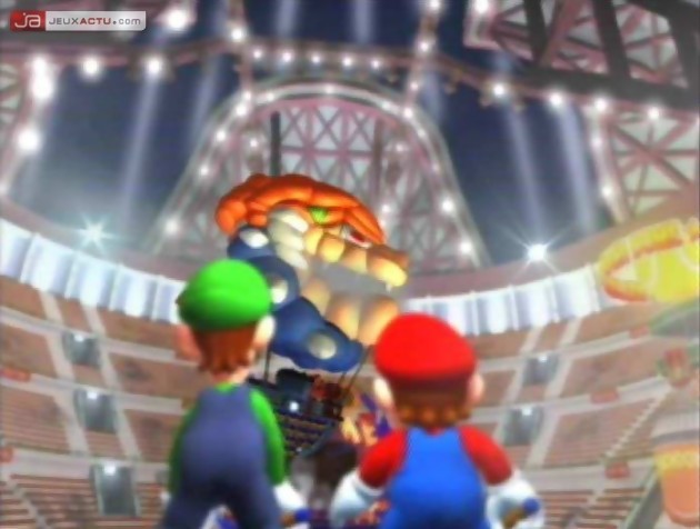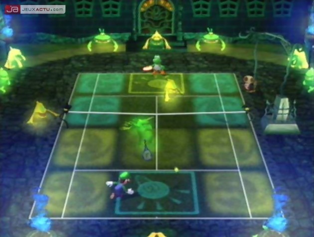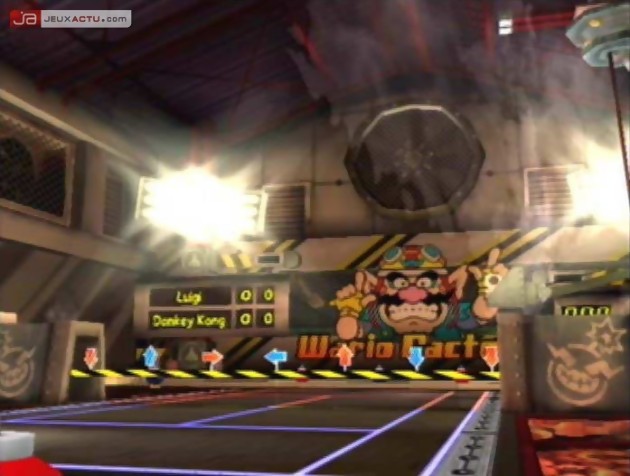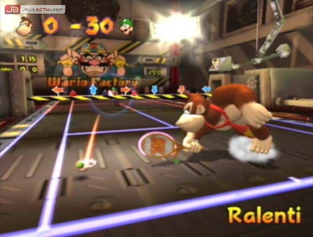 Pour ceux qui en avaient ras la casquette du trop de sérieux des Top Spin et Cie, Mario Power Tennis s'avère être un excellent remède. Chez Nintendo, c'est le délire qui prime. On ne se tape pas autant de barres qu'avec un bon coffret des Inconnus offert à Noël, mais ça change tout de même le paysage. Que ce soit en single player ou en multijoueur, les coups tordus sont au rendez-vous. Hormis les traditionnels courts auxquels on a droit lorsque l'on regarde le tennis sur les chaînes sportives - terre battue, gazon et surface rapide - il existe également d'autres terrains spéciaux dans le mode Gimmick Match. Lorsque l'on y débarque pour la première fois, c'est la totale ! Des Lacoste qui viennent grignoter les doigts de pieds, des fantômes qui glissent des peaux de banane sous les souliers, des courts qui s'agrandissent ou se rétrécissent selon l'impact de la balle... Autant vous le dire tout de suite, on se sent un peu perdu au départ. Mais une fois le principe saisi, on essaie tant bien que mal à rester debout sur ses jambes. Mention spéciale pour le Wario Factory Court qui va en énerver plus d'un. Explications : le terrain est divisé en plusieurs parties roulantes, et des flèches indiquant des directions différentes se situent juste au-dessus du filet. A chaque fois que la balle touche l'une de ces flèches, les tapis roulants bougent dans la direction indiquée. Imaginez-vous en train d'essayer d'atteindre une balle située à votre droite avec un tapis vous entraînant vers la gauche. Bon courage !