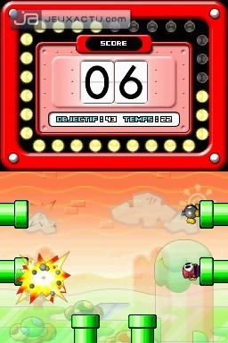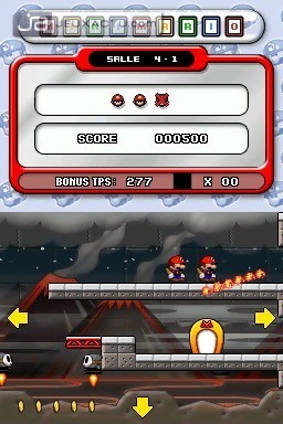 Cela dit, Mario Vs. Donkey Kong 2 est un jeu ultra-accessible, même pour les mononeurones. La faute à un niveau de difficulté mal ajusté qui donne accès au stage suivant dès lors qu'un mini-Mario atteint la sortie. Même constat pour les affrontements contre Donkey Kong venant ponctuer les dernières marches de chaque étage. A l'aide d'un canon et d'un mini-Mario faisant office de boulet, on doit flinguer le bougre tout en esquivant les gravats qu'il peut balancer. Pour trouver dans le jeu ne serait-ce qu'un peu de challenge, il faut alors prendre le soin de respecter certains critères qui permettent d'engranger un maximum de points. L'idéal serait donc de terminer le niveau d'une traite, sans s'arrêter et en ramassant toutes les pièces. Des points bonus sont également accordés si on fait sortir les mini-Mario en file indienne, tout ça dans l'espoir d'obtenir une étoile d'or, d'argent ou de bronze, passeports indispensables pour accéder à des trésors cachés du jeu. Sont aussi éparpillées sur un même étage neuf cartes qui, une fois regroupées, composent le terme "MINIMARIO", ce qui débloque un mini-game basique dans lequel on doit frapper des Maskass avec le stylet. Pas vraiment de quoi sauter au plafond. Par contre, on appréciera la possibilité de créer ses propres niveaux grâce au mode Construction. On dispose alors d'éléments tirés des différents mondes terminés; mais apparemment il n'est pas possible de croiser les genres. Une fois la toile terminée, on peut la diffuser sur le réseau via le online, ou bien l'envoyer tout simplement au voisin, pour peu qu'il ait une DS et une copie du jeu.