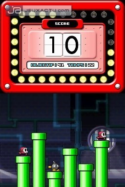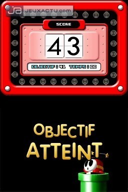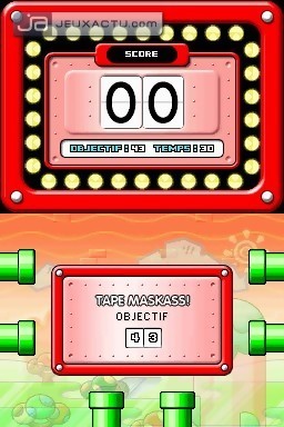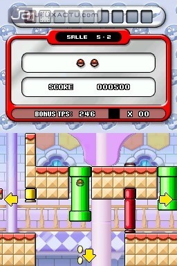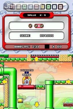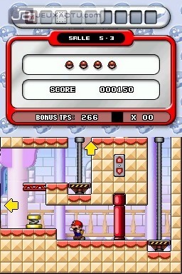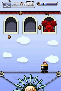 Cela dit, Mario Vs. Donkey Kong 2 est un jeu ultra-accessible, même pour les mononeurones. La faute à un niveau de difficulté mal ajusté qui donne accès au stage suivant dès lors qu'un mini-Mario atteint la sortie. Même constat pour les affrontements contre Donkey Kong venant ponctuer les dernières marches de chaque étage. A l'aide d'un canon et d'un mini-Mario faisant office de boulet, on doit flinguer le bougre tout en esquivant les gravats qu'il peut balancer. Pour trouver dans le jeu ne serait-ce qu'un peu de challenge, il faut alors prendre le soin de respecter certains critères qui permettent d'engranger un maximum de points. L'idéal serait donc de terminer le niveau d'une traite, sans s'arrêter et en ramassant toutes les pièces. Des points bonus sont également accordés si on fait sortir les mini-Mario en file indienne, tout ça dans l'espoir d'obtenir une étoile d'or, d'argent ou de bronze, passeports indispensables pour accéder à des trésors cachés du jeu. Sont aussi éparpillées sur un même étage neuf cartes qui, une fois regroupées, composent le terme "MINIMARIO", ce qui débloque un mini-game basique dans lequel on doit frapper des Maskass avec le stylet. Pas vraiment de quoi sauter au plafond. Par contre, on appréciera la possibilité de créer ses propres niveaux grâce au mode Construction. On dispose alors d'éléments tirés des différents mondes terminés; mais apparemment il n'est pas possible de croiser les genres. Une fois la toile terminée, on peut la diffuser sur le réseau via le online, ou bien l'envoyer tout simplement au voisin, pour peu qu'il ait une DS et une copie du jeu.