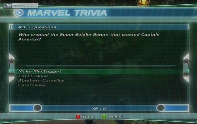 Executioner, Enchantress, Mephisto, Blackheart, Arcade, Mandarin, Kraken, Grey Gargoyle, Attuma, Tigershark, M.O.D.O.K, Fin Fang Foom, Loki, Galactus, Ymir, Deathbird, Gladiator ou Titannus, tous se sont passés le mot pour venir en aide à Dr. Fatalis (Dr. Doom). A l’image de Dragon Ball Z : Budokai Tenkaichi 2, Marvel Ultimate Alliance est très complet jusqu’à pousser le vice encore plus loin en testant les connaissances des joueurs à travers plusieurs quiz successifs permettant de glaner des points d’expérience. Et oui, car comme tout bon hack’n slash qui se respecte, Marvel Ultimate Alliance fleurit de point d’XP, d’évolution, de pouvoirs à débloquer et d’items à ramasser. Au fur et à mesure que vous éliminez vos résistants, votre équipe gagne en puissance, en défense et en santé jusqu’à débloquer des nouvelles tenues et des pouvoirs inédits qui sont bien évidemment en rapport avec l’historique du personnage concerné. Ainsi Wolverine débloquera de nouvelles compétences au corps à corps, Blade utilisera avec finesse son poignard-boomerang, Ghost Rider soufflera les flammes de l’Enfer et Thor pourfendra le sol de sa hache. De plus, vous pourrez augmenter manuellement ou automatiquement vos performances grâce aux pièces de monnaie que vous récupèrerez et aux accessoires que vous trouverez dans les coffres ou sur les corps des boss.