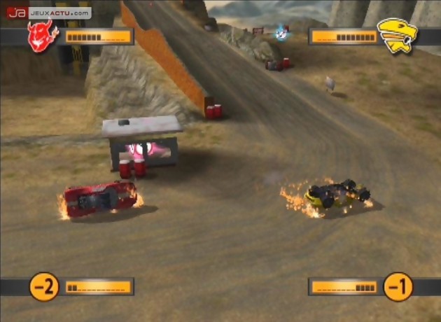 Mis à part les épreuves vous demandant de finir une course sans vous faire éjecter par les autres ou dans un temps limité entre chaque checkpoint sous peine de voir votre voiture exploser, Mashed Fully Loaded vous demandera surtout de cumuler les points. Les courses dépassant rarement la minute, il vous faudra prouver que votre victoire n’était pas un hasard et donc reproduire celle-ci un certain nombre de fois. Mais si chaque pole position vous gratifie d’un point ou deux, un mauvais classement peut tout aussi vite vous faire retomber et donc créer un nombre de manches successives parfois incalculable. Le mode solo présente donc alors par moment une certaine forme de répétitivité et nous condamne à appeler les potes pour jouer en multijoueur. Si les remarques et insultes gentillettes ne manqueront pas dans le feu de l’action, les propos de vos amis ne pourront que dépasser ceux de l’IA du jeu (avec un « va te faire regarder » particulièrement affligeant), et surtout vous pourrez y répondre, aussi bien verbalement que concrètement dans le jeu. Grande absente du mode solo, l’attaque aérienne va en effet vous permettre de venger votre éviction du terrain ou encore de choisir qui sera le prochain à sortir de piste pour rééquilibrer le tableau des scores. Attention aux alliances.