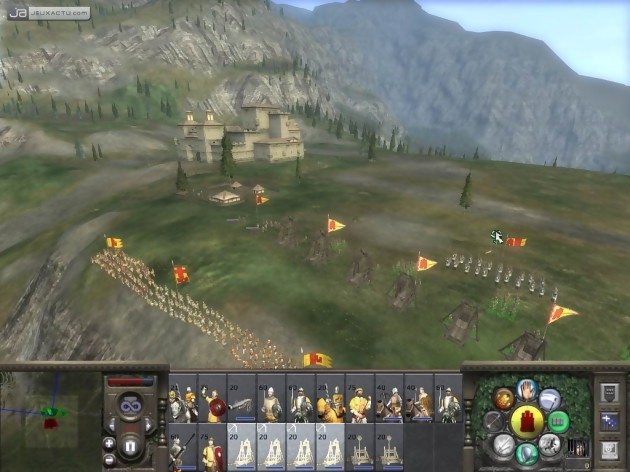 Tout d’abord, il faut savoir que les jeux Total War se décomposent en deux phases bien distinctes : des phases de jeu au tour par tour et d’autres, en temps réel. Bien que ce soit la deuxième qui fasse l’originalité du titre, la première n’est absolument pas anecdotique. Bon, disons-le tout net, c’est vraiment très proche de Civilization. Ce serait en effet comme le hit de Sid Meier sans son ambition (amener un peuple de l’âge des cavernes à l’âge moderne, c’est quand même du lourd) et surtout, sans son arbre technologique. Concrètement, tout est un peu plus light. Le principe reste cependant le même. A vous de conquérir le continent après avoir conquis un maximum de villes, les avoir améliorées, levé des armées… Les cités et les châteaux ont des modes de fonctionnement tout à fait différents. Disons que les premiers concernent les civils et les seconds les militaires. Bien sur, tout devient vite inter dépendant. Les villes apportent de l’argent qui vous permettra de lever des armées bien plus grandes ou créer des bâtiments. Les cités permettent également de lever des troupes mais celles-ci sont composées de paysans et donc bien moins efficaces que celles produites dans les forteresses. Ce que vous ferez de votre argent n’aura pas simplement des conséquences dans votre royaume. Le Benoit XVI de l’époque vous observe de son petit quartier romain, le Vatican. Si dans vos constructions, vous négligez trop le clergé, il sera en courroux. Et il faut remettre les choses dans leur contexte ; à l’époque, on ne rigolait pas avec la religion. Cela ne veut pas dire qu’entrer dans une église actuellement revient à rentrer dans une soirée d’Ibiza mais depuis Cauchon, l’église a atteint une certaine souplesse. Elle ne vous enverra pas par exemple son armée si vous n’avez pas édifié des bâtiments à la gloire de Dieu, comme c’est le cas dans le jeu. Contrairement aux précédents volets, la religion n’est pas qu’une succession de contraintes. Si un pape disparaît, vous pouvez maintenant influer dans la réélection d’un nouveau pour bénéficier d’un peu plus de souplesse les années suivantes. Il est remarquable de constater que tout se tient magnifiquement entre la gestion de la ville, les rapports politiques et quelques intervenants extérieurs comme les assassins qui vous permettent de zigouiller un seigneur local ni vu ni connu.