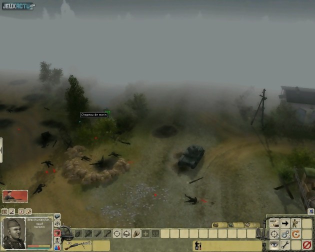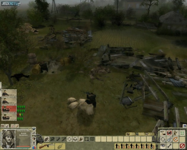 On retrouve en revanche facilement ses marques en ce qui concerne l'univers du jeu puisqu'il s'agit une fois de plus de la seconde guerre mondiale. On commence franchement à saturer mais, heureusement, Men of War : Red Tide se concentre sur le front de l'est et plus particulièrement sur les évènements ayant eu lieu autour de la mer Noire. On commence donc l'aventure en septembre 1941 à Grigorievka, un village proche d'Odessa, aux commandes du troisième régiment de marine de la mer Noire. Cette unité d'élite soviétique est spécialisée dans les opérations près des côtes et multiplie donc les scènes de débarquement (plus ou moins réussies, puisque certaines commencent par un crash d'avion ou un naufrage de navire). Le moteur 3D utilisé pour représenter l'action n'est pas extrêmement spectaculaire, mais il reste très honnête et suffisant pour retranscrire de manière convaincante les différents évènements. Il offre surtout une grande destructibilité des décors. Les abris de fortune, fussent-ils constitués de véritables habitations, ne résistent pas longtemps aux tirs de mortier. Il faut donc sans cesse placer au mieux ses unités et réévaluer en permanence les meilleurs positions de tir disponibles. Le jeu nous aide en cela grâce à une prévisualisation "fantomatique" de la position d'arrivée de nos hommes. Plus concrètement : en sélectionnant un groupe puis en approchant le curseur de souris d'une zone de couverture, les silhouettes grisées des soldats apparaissent et représentent de manière détaillée leur posture (à genoux, dos au mur, etc.). Avant de cliquer et de donner l'ordre de déplacement, on peut alors adapter au mieux la formation en testant précisément différentes zones d'arrivée, afin d'éviter par exemple qu'un des hommes se retrouve à découvert ou dos à l'ennemi. Un souci du détail qui résume parfaitement l'état d'esprit général du jeu : complet, complexe, exigeant, mais qui fournit tous les outils pour définir au mieux ses tactiques de combat.