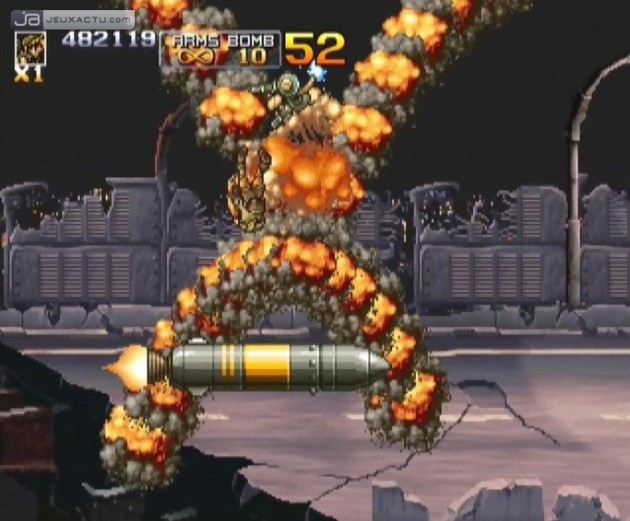 Quels sont les ingrédients indispensables pour réussir un bon Metal Slug ? C’est relativement simple. Des graphismes bien léchés (en 2D de préférence), des animations toutes aussi réussies, de l’action tout azimut, une bonne pointe d’humour, des Boss énormes pour nous faire vibrer et pour finir un level design mémorable. Metal Slug 5, à l’instar de Metal Slug 4, réunit la plupart de ces condiments nécessaires à une recette digne d’un grand chef, à la différence près que les niveaux proposés manquent encore de fantaisie pour le placer parmi les meilleurs opus de la série. En d’autres termes, Metal Slug 5 poursuit à peu de choses près les mêmes erreurs qu’on pouvait reprocher à Metal Slug 4, à savoir un manque flagrant d’imagination du côté des 5 niveaux proposés. Toutefois, il est de bon ton de souligner qu’un réel effort a été produit au niveau des slugs, ces fameux engins mécaniques que l’on peut piloter au cours des niveaux. Ils ne sont guère nombreux, c’est vrai mais chacune de leur apparition ne manquera de nous faire sourire. On pense tout particulièrement au spider slug, une araignée mécanique et métallique dotée d’un harpon en guise d’arme secondaire et à la force de frappe expéditrice. La slug mobile fait également partie de moments les plus fendards du jeu avec une séquence de course-poursuite assez mémorable. Assez basique dans le fond, le gameplay de Metal Slug 5 introduit un nouveau mouvement : la glissade au sol. Elle offre ainsi la possibilité à nos quatre héros de glisser sur le dos tout en tirant continuellement. Cela permet ainsi à se sortir de situation délicates, surtout lorsque les tirs aériens se font nombreux. Ce n'est pas grand chose certes mais c'est déjà ça de pris.