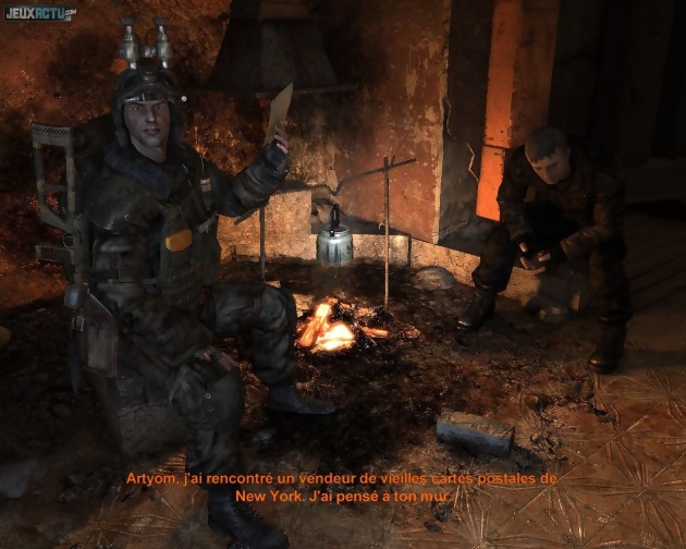 Un cendrier sur lequel repose une cigarette encore fumante, une vieille machine à écrire munie de touches en cyrillique, le livre Metro 2033 dont est tiré le jeu, le plan du métro moscovite en guise d'interface de chargement et deux hommes en armure gardant la porte permettant de quitter le jeu : l'écran principal impose d'emblée sa marque et nous plonge directement dans un univers post-apocalyptique rude et crasseux. L'aventure se déroule dans un Moscou encore dévasté par la catastrophe atomique de 2013. Les rares survivants ont trouvé refuge dans les couloirs du métro, se condamnant ainsi à vivre sous terre en raison de l'hiver nucléaire qui rend la surface impraticable. Vingt ans plus tard, les enfants et adolescents qui occupent les différentes stations n'ont jamais vu la couleur du ciel, tandis que les adultes collectionnent avec nostalgie les cartes postales représentant des villes ensoleillées et se tiennent toujours prêt à l'affrontement avec les créatures mutantes alentours. Ce contexte ne nous est pas présenté par un laborieux texte d'introduction, ni même par le truchement d'une quelconque scène cinématique. Il s'impose de lui-même, en douceur, grâce à un  souci du détail extrême de la part des développeurs et à un talent certain pour installer une ambiance captivante. Une fois passé le didacticiel en forme de prologue, la première balade que l'on effectue dans l'une des stations souterraines frappe un grand coup. Qu'il s'agisse des petites scènes de vie qui nous sont présentées, des différents lieux et éléments de décor croisés, des personnages principaux comme secondaires, et des dialogues qu'ils prononcent, tout suinte la désolation et raconte le nécessaire instinct de survie, qui tient tout autant de l'espoir que du désespoir. L'ambiance triste et oppressante ne tient pas seulement au fait de croiser des orphelins, des estropiés et des réfugiés à tous les coins de rue, elle est également distillée par la somptueuse musique, d'une mélancolie typiquement slave. Aisément identifiable dès les deux premières notes (c'est d'ailleurs un signe incontestable de sa qualité), le thème principal file instantanément le bourdon et donne le la d'une bande-son toujours magistrale.