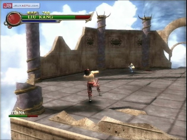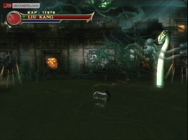 A chaque fois que vous enlevez la vie, votre expérience augmente. Et à la manière d’un RPG, vous pourrez ensuite personnaliser les attaques de Liu Kang ou Kung Lao selon vos désirs. Caractérisée par des orbes verdoyants, l’XP peut également être recélée dans des objets destructibles tels que les jarres ou les statues. Cependant, lorsque vous vous servez du décor pour anéantir vos ennemis ou si vous avez recours à une multality ou une brutality, vous ne serez pas gratifié de cette gélatine verte. Ce serait bien trop facile. Il faudra donc mériter cette expérience et privilégier les combats au corps à corps jusqu’à votre ennemi explose en lambeaux de chaire et d’os. Cela dit, les armes que vous trouverez sur votre chemin vous aideront grandement dans cette tâche de par leur puissance de frappe importante. Une fois ce joli monde mis en pièce, vous pourrez tranquillement débloquer plus de combos et d’attaques spéciales qui seront récapitulés dans votre profil du joueur. Bien pratique lorsqu’on ne se souvient plus de la manipulation à faire lorsque la voix-off annonce « finish him ». Puisque j’évoque le doublage, sachez que MK : Shaolin Monks est intégralement en français. Si Midway nous avait impressionné cet été avec Area 51, le résultat est assez décevant ici. Tout d’abord parce que cette voix-off n’est pas la même que d’habitude ce qui agacera les joueurs de Mortal Kombat les plus aguerris. Ensuite parce que certains doubleurs donnent l’impression d’être sorti tout droit d’une sitcom AB Production avec leur ton faussement convaincant. Mais un effort de localisation a été fait et cela mérite d’être souligné quand même. Quant à la réalisation graphique, la claque visuelle n’est pas au rendez-vous. La modélisation des personnages, notamment au niveau des visages, est plus que basique et il est regrettable de voir que les cut-scènes exploitent le moteur du jeu et ne sont pas faites en images de synthèse surtout qu’après la scène d’intro, notre cœur bat la chamade pour en voir toujours plus. Si sur le travail des personnages on peut chipoter, en ce qui concerne les décors, rien à redire. Ça fourmille de détails et la création des niveaux de Outworld ne manque pas d’originalité de par le choix des couleurs ou les éléments interactifs mis à notre disposition.