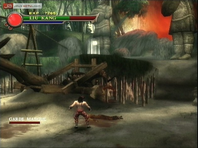 Vous pourrez, selon l’inclinaison du stick analogique gauche, tabasser n’importe quel individu et basculer sur son confrère sans perdre le rythme de vos enchaînements. Et si vous sentez que vous perdez le contrôle de la situation, en plus du bouton garde, vous pouvez avoir recours aux attaques aériennes et poursuivre tranquillement votre combo dans les airs. Si vous commencez par une série de coups de tatanes, rien ne vous empêche de continuer avec une projection et balancer ainsi votre opposant dans le décor ou sur ses congénères. En parlant du décor, soyez toujours attentif aux éléments qui vous entourent car ils peuvent se révéler impitoyables tant pour votre personne que pour vos ennemis. Piques acérées, torches, catapultes, falaises, lave ou arbres dévoreurs d’hommes, selon les paysages dans lesquels vous évoluerez, vous pourrez exécuter des fatalités de stage largement inspirées des jeux de baston Mortal Kombat. Chaque attaque portée augmentera votre jauge de combos, pouvant atteindre aisément les 80 coups d’affilée, qui, une fois pleine, servira à finaliser votre combat d’une fatality, d’une brutality ou encore d’une multality. Ce jargon propre à Midway et bien connu des fans de la série permet de se débarrasser d’un ou plusieurs assaillants après avoir réaliser une manipulation bien spéciale. Et c’est dans un flot de sang et de feu que vous verrez périr les hommes de Shang Tsung.