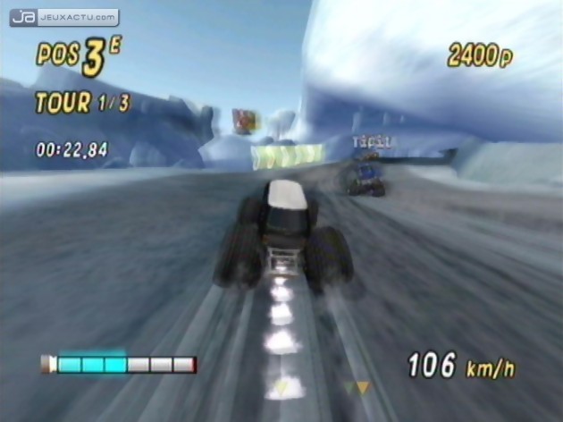 Inutile de sortir son Nunchuk, le module n’a aucune utilité ici. Placée à l’horizontale, la Wiimote se dirige ainsi tel un véritable volant. D’ailleurs, afin d’immerger davantage le joueur et lui offrir des sensations uniques, Ubisoft a eu l’ingénieuse idée de proposer un volant en plastique à assembler tel un meuble sorti des usines d’Ikea. Une bonne idée en soi, que les plus jeunes sauront apprécier à sa juste valeur, d’autant que le produit est plutôt solide et de bonne qualité. Mais ce n’est malheureusement pas l’ajout de cet accessoire facultatif qui nous fait oublier une reconnaissance des mouvements parfois hasardeuse et souvent en décalage avec nos mouvements. L’exigence avant tout, surtout quand on a pu découvrir que les fonctionnalités de la Wiimote peuvent être parfaitement gérées (exemple : Wii Sports et WarioWare : Smooth Moves pour ne citer qu’eux). A côté de ça, impossible de nier les sensations de vitesse engendrées par un Monster 4x4 : World Circuit qui mise avant tout sur le fun. C’est pourquoi, les développeurs se sont inspirés d’un concept plagié maintes et maintes fois, à savoir celui de Mario Kart. Ainsi, tout en roulant, il est possible de récupérer des items placés à des endroits bien spécifiques du circuit. Mais ces bonus ne peuvent en aucun cas être conservés - au cas où l’envie de flinguer le premier de la course avant qu’il ne franchisse la ligne d’arrivée ne nous tranversait subitement l'esprit - et s’utilisent uniquement lorsque l’engin leur passe dessus. Drôle d’idée. Missiles pour gagner du boost et barils pour ralentir un concurrent, la variété des items est quasi inexistante et ce ne sont pas les quelques modèles de voitures qui peuvent rattraper cette carence.
