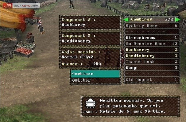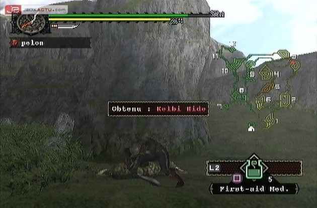 Mais en mode solo, l’aspect physique de votre personnage n’est pas votre priorité. On est bien trop occupé à découvrir en détails les différents aspects de cet Action-RPG et à vouloir chasser à tout prix du dinosaure. Cela dit, vous n’êtes qu’un novice en la matière et le chef de votre petit village prendra mille précautions avant de vous envoyer pourfendre du Wyvern. C’est donc très calmement, trop même, que vous commencez votre apprentissage en acceptant les missions du vieillard. Celles-ci sont classées en deux catégories. Les premières que vous découvrirez sont des missions de collecte. Si elle ne sont guère passionnantes, elles ont au moins le mérite de vous apprendre les rudiments de la chasse, des précautions à prendre vis-à-vis des espèces animales jusqu’à la survie en terres hostiles. Vous devrez donc remplir certaines conditions pour revenir en héros au village telles que ramasser tant des cornes de Kelbi, dénicher des herbes curatives, trouver une toile d’araignée ou encore préparer des potions. La plupart du temps, vous devrez faire confiance à votre instinct de survie en furetant dans les fourrés, en creusant à même le sol à la recherche des précieux ingrédients. Parfois même, vous devrez combiner plusieurs objets afin d’obtenir le breuvage adéquat. Ces séquences sont plutôt fastidieuses et souffrent d’une certaine lenteur. Votre personnage n’est pas des plus pressés et c’est les mains dans les poches qu’il s’accroupit, farfouille le sol et découvre ce qu’il y a à trouver au pied d’un arbre ou dans des cavités rocheuses. Apparaît alors à l’écran un message vous annonçant votre butin en anglais (?!). Il faudra réitérer ces actions plusieurs fois de suite pour laisser la terre vierge de tout item. Y a pas plus casse-pieds ! Mais bon, c’est un passage obligé avant d’arriver au gros de Monster Hunter : les Missions de Chasse. Ici, on vous demandera de tuer un nombre précis de dinosaures. Vous aurez compris que la tâche ne sera pas des plus faciles notamment face à des espèces carnivores. Si les herbivores ne représentent que peu de menaces, excepté les moments où ils chargent ou se défendent d’un coup de queue, les autres créatures sont beaucoup plus belliqueuses n’hésitant pas à vous attaquer en groupe. Vous devez donc vous improviser chasseur !