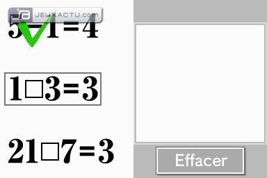 Le fun du premier opus en pâtit un peu, Programme d’Entrainement Cérébral Avancé du Dr Kawahisma : Quel âge a votre cerveau ? pointe pour l’instant vers des cahiers "Passeport" animés (marché très lucratif), à la différence près que Nintendo propose moins d’illustrations et soulage plutôt les consciences des plus de 20 ans, puisque le docteur aurait décidé que cet âge représente le plus haut de notre performance. Le Programme d’Entrainement Cérébral Avancé du Dr Kawahisma propose un panel de nouveaux exercices, plus complexes pour les utilisateurs dits "avertis". Bonne approche puisque le message incite bien le consommateur à penser que l’idéal est d’amorcer l’entraînement avec la version initiale, avant de poursuivre le programme avec ce More Brain Training pour un entraînement régulier et efficace. On remarquera le jeu de Shifumi "pierre, feuille, ciseau" présent en évaluation, où il s’agira de gagner ou perdre face à la main virtuelle. Il faudra parfois s’armer de patience face à une reconnaissance vocale pas toujours au top et donc perfectible. Bien sûr les calculs mentaux sont au rendez-vous, avec des exercices tels que "Opérateurs vides", où vous devrez déterminer le type d’opération utilisé pour l’obtention du résultat (addition, soustraction, multiplication ou division) et en indiquer le symbole. Si vous en avez marre de passer un temps fou à calculer la monnaie rendue aux caisses, l’exercice "Monnaie", assez intuitif et utile devrait vous correspondre. Le concept est simplissime et plaira aux nostaliques de la dinette : vous devez calculer le plus rapidement possible la monnaie à rendre pour une somme donnée et sélectionner à l’aide du stylet les pièces à utiliser. L’exercice "Mélomane" est assez agréable et permet de pianoter des notes, toujours à l’aide du stylet, en suivant une partition. Avec un peu d’entraînement, il sera possible de jouer un morceau de façon plus fluide.