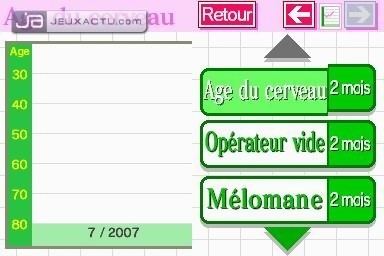 Autre stimulation auditive, l’exercice "Brouhaha" est fait pour mettre votre concentration à l’épreuve : il faudra se dépêcher de reporter sur son écran les mots débités simultanément. Intéressant et énervant à la fois. On se surprendra à faire répéter à de nombreuses reprises (cinq au maximum) avant de comprendre chaque mot. Pas évident de distinguer et comprendre 3 termes prononcés en simultané. Pour ceux qui n’ont pas fait de révision de cours depuis longtemps, "Mémoire 5x5" ravivera cette sensation de stress des examens. Le programme est poussé avec l’exercice addition cachée qui mixte mémorisation et calcul mental. Il faut s’accrocher pour additionner et à chaque fois se souvenir du chiffre précédent composant l’addition, pour l’additionner ensuite au nouveau chiffre, qu’il faudra d’ailleurs retenir pour la prochaine addition ! Le tout associé à la contrainte temps, et vous obtenez un cocktail permettant d’entraîner ses nerfs. Avis aux amateurs, le traditionnel Sudoku fait toujours partie du programme, et reste inchangé, si ce n'est de nouvelles grilles. En fait, la seule vraie originalité de ce volet réside dans le remix du bon Dr Mario, ici nommé "Bactéricide". Sympathique. Présenté comme un outil sérieux par l’éminent Mac Lessgy, représentant de l’émission E=M6 puis par des personnalités telles que Michèle Laroque ou Nicole Kidman, la gamme du Dr Kawahisma se veut rassurante et gagne le pari d’être un produit star qui par sa promotion ferait exploser les records de vente s'il était vendu au Téléshopping. Le Programme d’Entrainement Cérébral Avancé du Dr Kawahisma : Quel âge a votre cerveau ? est donc une valeur sûre pour Nintendo et sera réclamé par les férus d’optimisateurs de performances qui souhaitent s’immerger dans une cure cérébrale.