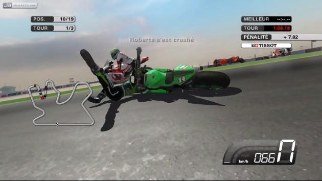 Puisque la cuvée 2006 du Moto GP de Climax et de THQ était abonnée aux absents, Moto GP '07 se devait de faire mieux que les précédents épisodes en ce qui concerne la partie graphique. Si le jeu se montre bien plus réussi visuellement que d'habitude, force est de constater qu'il lui manque encore beaucoup de chemin pour se classer parmi les plus beaux jeux du moment. Décors fades et bien souvent vides, à l’exception de quelques circuits dans le mode Extreme, Moto GP '07 manque singulièrement de folie. De loin, les deux-roues apparaissent comme relativement bien modélisés mais en s’approchant de plus près, on se rend compte que les textures restent assez basiques dans l’ensemble. Toujours pas de gestion de dégâts, alors que c’est désormais devenu une institution dans n’importe quel jeu de voitures, des pilotes qui arborent toujours une combinaison impeccable et ce, même après une vingtaine de gamelles ; à l’ère de la révolution graphique, on attend toujours ces petits détails qui font la différence. Pire, lorsqu’on bascule en vue guidon, on s’aperçoit à quel point les textures manquent cruellement de détails, avec un tableau de bord qui ne colle pas toujours avec la réalité. Le résultat est aussi décevant lors des séquences qui précèdent chaque course, où l’on peut voir son coureur entouré de son équipe mais aussi de babes déambulant dans la foule. Personnages cubiques, animations archi-raides, Moto GP '07 affichent sans pudeur ses carences graphiques. Damned !