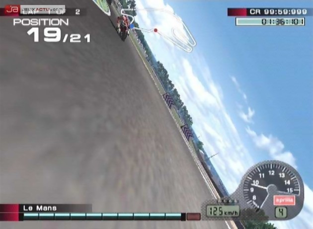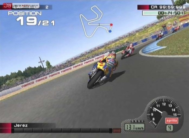ininterrompus comme dans les vrais grands prix. On reprochera par contre à Moto GP 4 l’absence remarquée d’un mode en ligne d’autant plus qu’il est disponible outre-Atlantique. Techniquement, la réalisation est dépassée. Les différents environnements sont d’une pauvreté effrayante. L’aliasing et le scintillement n’a jamais autant piquer les yeux. On reconnaîtra néanmoins le travail de fond apporté sur la modélisation des véhicules et des circuits. De même, certains détails feront sourire les plus avertis comme le pilote tournant la tête pour regarder derrière lui, les avions ou les deltaplanes survolant la piste ou bien encore les publicitéss abondantes des dernières productions Namco. L’animation reste très fluide excepté lors de phases où les motos se regroupent entre elles, provoquant alors quelques menues saccades.