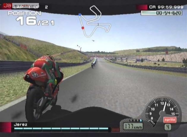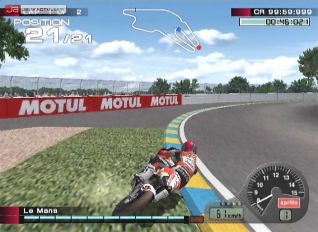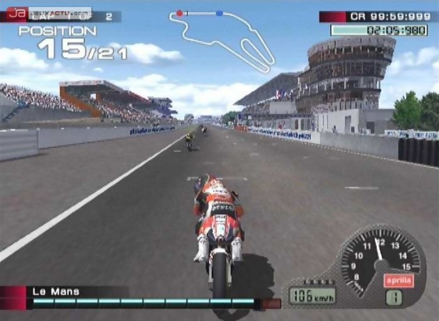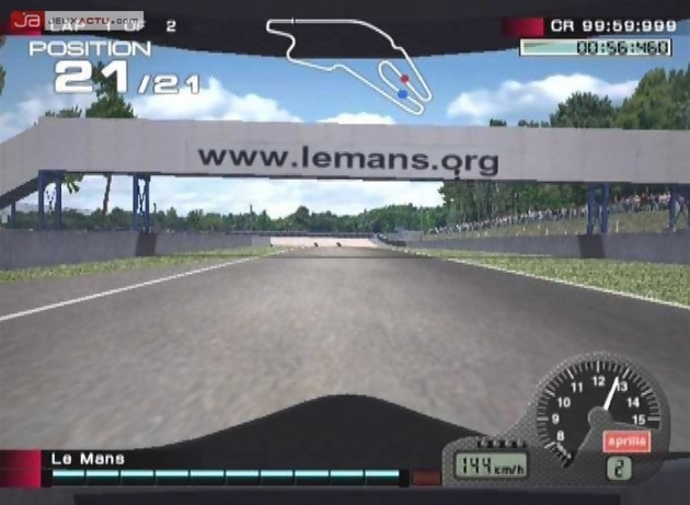 ininterrompus comme dans les vrais grands prix. On reprochera par contre à Moto GP 4 l’absence remarquée d’un mode en ligne d’autant plus qu’il est disponible outre-Atlantique. Techniquement, la réalisation est dépassée. Les différents environnements sont d’une pauvreté effrayante. L’aliasing et le scintillement n’a jamais autant piquer les yeux. On reconnaîtra néanmoins le travail de fond apporté sur la modélisation des véhicules et des circuits. De même, certains détails feront sourire les plus avertis comme le pilote tournant la tête pour regarder derrière lui, les avions ou les deltaplanes survolant la piste ou bien encore les publicitéss abondantes des dernières productions Namco. L’animation reste très fluide excepté lors de phases où les motos se regroupent entre elles, provoquant alors quelques menues saccades.