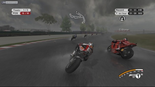 Le contenu de MotoGP 08 assure l'essentiel, à savoir la présence de toutes les écuries officielles des catégories 125cc, 250cc et MotoGP - Yamaha Tech 3, Ducati, Suzuki, Kawasaki par exemple -, des pilotes naturellement - Valentino Rossi, Casey Stoner, Dani Pedrosa, Marco Melandri, Loris Capirossi, Nicky Hayden pour les plus connus -, et des circuits répartis aux quatre coins de la planète. Pas de surprise donc, si ce n'est la possibilité de jeter un coup d'oeil aux classes inférieures nettement moins médiatisées, sauf lorsqu'un pilote français parvient à réaliser un miracle. Plus sérieusement, il est possible de mener sa propre carrière qui s'étale sur plusieurs saisons. Pour espérer goûter à la catégorie suprême, le newbie devra d'abord se faire les dents en 125 et en 250cc. Bien vu. Bien vu également les Points d'Evolution que l'on récolte à la fin de chaque course - à condition d'être bien placé au classement -, et qui permettent d'améliorer le rendement de sa bécane sur quatre points précis : vitesse max, freinage, accélération, direction. Hormis le mode Carrière, on peut aussi se lancer dans un Championnat on ne peut plus classique, ou bien tenter sa chance dans un Contre-La-Montre pour claquer quelques records. Sinon, les Défis sont là pour tenter de varier les plaisirs : il s'agira alors d'accomplir un certain nombre de tâches dans des conditions de course définies. Enfin, on ajoutera quelques syllabes sur l'ambiance sonore de MotoGP 08 qui est de bonne facture, surtout concernant le rugissement des moteurs qui change d'une catégorie à une autre. Ce qui permet de masquer les thèmes musicaux un brin répétitives.