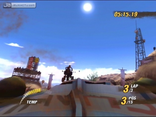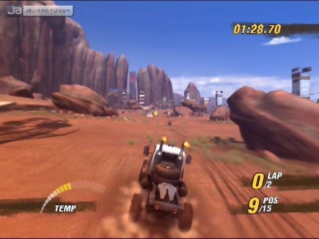 Monument Valley oblige, les tracés dans MotorStorm sont cabosseux, poussiéreux et parfois même sinueux. Ici une ligne droite n’est jamais vraiment droite et se reposer uniquement sur la trajectoire de son bolide n’est pas un conseil à vous donner. Heureusement, pas de formule un ou de berlines à conduire, les véhicules dans MotorStorm sont adaptés au terrain. Buggys, 4x4, quads, motocross, camionnettes ou bien encore poids lourds, chacun de ces engins possèdent des suspensions adaptées au terrain. Si dans l’absolu, chaque type de bolide proposé possède ses propres caractéristiques, force est de constater que tous partent sur le même pied d’égalité dans le sens où ils peuvent chacun franchir la ligne d’arrivée en tête du peloton. Bien évidemment, si le poids lourd possède quelques lacunes au démarrage, il compense par sa carrure imposante, capable de dégager les carcasses de voitures sur la route en leur fonçant dessus. A l’inverse, une moto ou un quad devra éviter les confrontations physiques avec un véhicule plus imposant, sous peine de voler en éclat ou de tomber dans le vide. En revanche, il est possible de filer quelques coups de mandales aux adversaires de la même catégorie, les attaques sur les côtés étant permis. Chaque véhicule ont un point en commun : la jauge de nitro. Disponible à tout moment mais en quantité limitée, le boost permet de passer de 0 à 100 en quelques fractions de seconde, idéal pour se remettre en selle après avoir fait une mauvaise chute. Mais, mieux vaut surveiller sa jauge car elle a tendance à faire chauffer le moteur et le faire exploser en cas d’utilisation abusive.