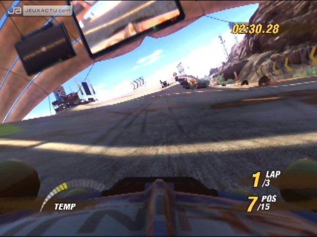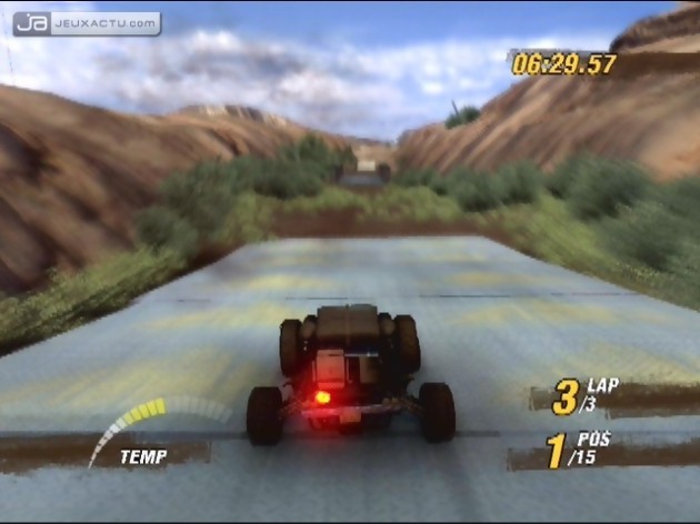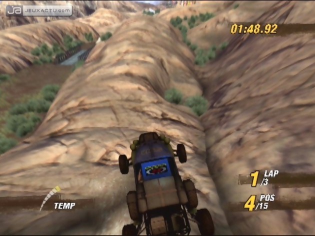 Monument Valley oblige, les tracés dans MotorStorm sont cabosseux, poussiéreux et parfois même sinueux. Ici une ligne droite n’est jamais vraiment droite et se reposer uniquement sur la trajectoire de son bolide n’est pas un conseil à vous donner. Heureusement, pas de formule un ou de berlines à conduire, les véhicules dans MotorStorm sont adaptés au terrain. Buggys, 4x4, quads, motocross, camionnettes ou bien encore poids lourds, chacun de ces engins possèdent des suspensions adaptées au terrain. Si dans l’absolu, chaque type de bolide proposé possède ses propres caractéristiques, force est de constater que tous partent sur le même pied d’égalité dans le sens où ils peuvent chacun franchir la ligne d’arrivée en tête du peloton. Bien évidemment, si le poids lourd possède quelques lacunes au démarrage, il compense par sa carrure imposante, capable de dégager les carcasses de voitures sur la route en leur fonçant dessus. A l’inverse, une moto ou un quad devra éviter les confrontations physiques avec un véhicule plus imposant, sous peine de voler en éclat ou de tomber dans le vide. En revanche, il est possible de filer quelques coups de mandales aux adversaires de la même catégorie, les attaques sur les côtés étant permis. Chaque véhicule ont un point en commun : la jauge de nitro. Disponible à tout moment mais en quantité limitée, le boost permet de passer de 0 à 100 en quelques fractions de seconde, idéal pour se remettre en selle après avoir fait une mauvaise chute. Mais, mieux vaut surveiller sa jauge car elle a tendance à faire chauffer le moteur et le faire exploser en cas d’utilisation abusive.