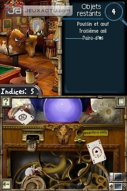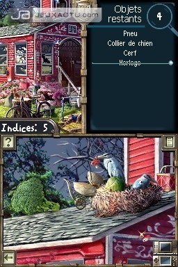 Autant mettre fin au suspense tout de suite : Mystery Case Files : MillionHeir n'est en rien un jeu d'aventure dans le style Nancy Drew ou Unsolved Crimes pour ne citer que les plus récents représentants du genre sur DS. Le titre de Big Fish Games s'apparente plutôt à un jeu d'objets cachés tels que l'on en voit sur PC et en flash sur le net. Le concept en est ultra simple : vous êtes plongé dans une pièce remplie de détails, vous avez une liste d'objets à trouver et un temps imparti pour les dénicher. La recherche s'effectue dans un univers en 2D fort séduisant (plus d'une trentaine de tableaux au total), dans lesquels on pourra se déplacer à notre guise grâce au stylet ou à la croix analogique. Par moment, il faudra s'équiper d'une lampe-torche ou d’un pistolet à rayons X pour faire sortir de leurs cachettes certains éléments mieux dissimulés que les autres. Bref, une sorte de "Où est Charlie ?" mais en version jeu vidéo, sauf qu'à la place du jovial bonhomme blanc et rouge, le joueur devra mettre la main sur des babioles telles qu'une paire de ciseaux, un poisson rouge ou bien encore un symbole du Ying et du Yang gravé sur un pied de table. Rien de bien neuf donc, même si le foisonnement de détails dans les décors rend la tâche plus corsée qu'elle n'y parait. Corsée oui, car à chaque fois que vous cliquerez au mauvais endroit, vous serez pénalisez par un retrait de temps dans votre chrono, parce que certains objets sont vraiment bien cachés ou très mal représentés. Heureusement, le titre nous offre quelques indices pour nous aiguiller dans nos recherches. Mieux, pour éviter toute monotonie dans le jeu, les développeurs ont eu la bonne idée d'y inclure quelques mini-jeux (puzzles à résoudre, jeu des 7 erreurs), pas très difficiles, mais qui ont le mérite d'exister pour sortir le joueur de son train-train quotidien. Dans le concept, tous les éléments semblent donc avoir été pensés pour rendre Mystery Case Files : MillionHeir agréable à jouer.