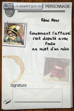 Mais c'était sans compter sur le gros point noir du jeu : son scénario, et plus globalement son déroulement. Mystery Case Files : MillionHeir raconte l'histoire d'un détective à la recherche d'un millionnaire (Emilio Nerr) mystérieusement disparu. Au cours de son investigation, il sera amené à rencontrer des suspects qu'il devra interroger pour aller au bout de son enquête. Quel est le lien avec les objets à trouver ? Aucun. Avant d'avoir trouvé les objets, les suspects ne voudront pas répondre. Après, si. Et ces objets en question n'ont aucun rapport avec l'enquête à proprement parler, vu que ce ne sont pas des indices (et qu'ils sont piochés par l'ordinateur de manière aléatoire) ! A n'y rien comprendre... ou plutôt, comprendre par-là que Big Fish Games a pondu une histoire prétexte pour porter sur console portable un concept qui cartonne sur PC, sans chercher à y relier la forme et le fond. Et dire que ce défaut est préjudiciable au jeu est un euphémisme, puisque dès lors qu'on a compris que cette histoire d'enquête n'avait strictement aucun sens, on se lasse extrêmement vite de Mystery Case Files. Sans cette petite once de suspense qui nous donne encore d’aller jusqu’au bout de l'affaire pour savoir ce qu'est devenu Emilio, on ne trouve que peu de motivation pour avancer dans le jeu. C'est fort dommage, car avec un effort de ce côté-là, on aurait certainement pris beaucoup plus de plaisir avec ce Mystery Case Files : MillionHeir, qui, en l'état, s'avère plutôt complet dans son style.