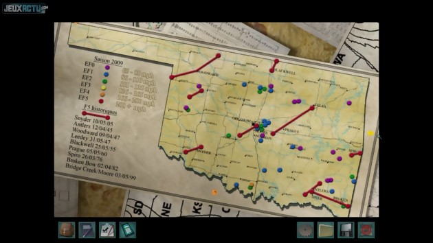 En ce qui concerne le scénario, Nancy Drew nous prouve une fois de plus qu'elle est bonne à tout faire. La voici embauchée parmi une équipe de scientifiques spécialisés dans le domaine des tempêtes ! La raison d'une telle assignation est simple : elle doit enquêter en secret sur une série d'avaries matérielles un peu trop nombreuses pour être honnêtes. Sachant qu'une subvention de 100 millions de dollars attend l'équipe de chercheurs qui réussira à prédire de manière fiable les points d'impact des tempêtes, il y a effectivement de quoi se montrer méfiant. Un tel contexte, plus sérieux que les habituelles histoires de fantômes et autres mystérieuses créatures, a le mérite de se montrer éducatif. On trouve ainsi de nombreux documents sur les tornades et la météorologie : dans les tiroirs que l'on fouille, les journaux que l'on ramasse, et même dans l’arrière-boutique de l'épicerie de Ma'n Pa, qui abrite une exposition sur le sujet. En contrepartie, le jeu se montre parfois un peu trop sérieux. Surtout en ce qui concerne les tâches dévolues à Nancy. Puisqu'elle se fait passer pour une simple stagiaire, elle doit effecteur régulièrement des petits travaux pas toujours très excitants (ranger des documents, aller faire des courses, réparer divers dispositifs...). Evidemment, chacune de ces corvées dissimule en réalité un mini-jeu ou une énigme, qui peut parfois se révéler intéressant ou distrayant. Mais l'ensemble manque tout de même singulièrement de souffle épique. Heureusement, quelques bons moments se font jour, comme celui où l'on passe en revue des confiseries aux emballages tous plus délirants (et bien réalisés) les uns que les autres. Cela ne suffit évidemment pas à faire un grand jeu, mais on sait que Nancy Drew possède un public dévoué à sa cause. Si vous en faites partie, retenez surtout que cet épisode figure parmi les plus honorables de la série.