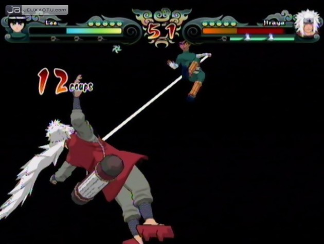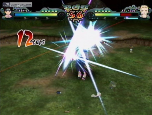 Ce n’est effectivement pas avec cette suite que vous pourrez reprendre la suite des événements du premier Naruto : Clash of Ninja Revolution - European Version, Tomy et Nintendo ayant visiblement décidé de snober le marché européen. A l’inverse, on a droit à l’apparition d’un nouveau méchant, au look atypique et loin d’être en concordance avec les autres personnages de la série. Ce dernier est d’ailleurs accompagné par une kyrielle de ninjas secondaires, jouables également par le joueur, notamment Komachi et Towa, deux Anbus à la command list plutôt efficace à défaut eux d’être charismatiques. Quoiqu’en dise, Naruto : Clash of Ninja Revolution 2 - European Version parvient à nous faire oublier le casting rachitique de son prédécesseur avec pas moins de 35 personnages disponibles. Evidemment, pour donner un semblant de challenge au joueur, la moitié des ninjas sont à débloquer en se lançant dans l’aventure du mode "Story". Une façon comme une autre de nous imposer cette histoire écrite en deux minutes et qui n’est là que pour justifier l’enchaînement de combats aussi passionnants qu’un épisode de Derrick. Paix à son âme. Car ce n’est pas avec Naruto : Clash of Ninja Revolution 2 - European Version que la série a décidé de se faire une petite cure de jouvence, loin de là même. Le gameplay reste certes efficace et son accessibilité fait partie des ses atouts majeurs, mais il faut quand même être bien indulgent pour laisser passer une telle fainéantise de la part des développeurs qui nous recyclent la même tambouille depuis 2003. Toutefois, on note quelques réajustements repris des derniers volets japonais comme la possibilité de switcher de personnage lorsqu’on combat en équipe. Histoire d’ailleurs d’apporter un peu plus de punch à ces affrontements en duo, il est même possible de combiner certaines attaques, ce qui apporte un peu plus de fraîcheur à la série. Pas de quoi non plus sabrer le champagne, la base reste identique depuis plusieurs années. Graphiquement, le titre n’a pas évolué depuis six ans. Le moteur commence à se faire vieux et la modélisation – assez cubique – des ninjas ne fait que s’accentuer d’épisode en épisode, ce qui prouve bien que la série a cruellement besoin d’un petit coup de chiffon pour redonner un peu de brillance à l’ensemble.