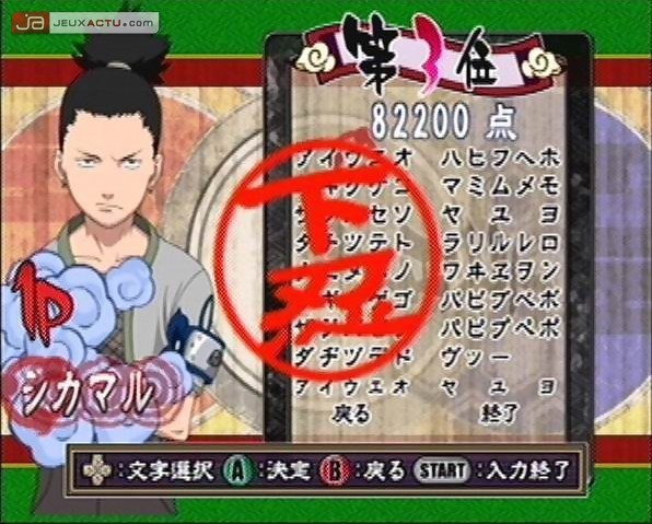Mais avant toute chose, le passage par la case Mission s’impose ! Cette fois, il se découpe en 32 missions (24 + 8 à acheter) et comme signalé plus haut, s’arrête à la confrontation entre Jiraya, Tsunade et Orochimaru, les trois disciples du troisième Hokage. Le reste des missions étant consacré à des combats fictifs. Mais les concepteurs ont poussé le vice encore plus loin puisqu’il faudra désormais terminer les combats d’une manière bien précise. Rock Lee devra, par exemple, battre Gaara avec son ultime furie, le fameux Ura Renge. Orochimaru, quant à lui, devra obligatoirement  vaincre Tsunade avec sa jauge de vie au plus bas (lorsqu’elle se trouve dans le rouge) tandis que Naruto combinera un 2 hits combo suivi de son Rasengan pour mettre Orochimaru au tapis. Autant vous dire que la partie ne sera pas de tout repos, surtout lorsque les textes s’affichent avec des kanjis et autres katakanas. Ces objectifs bien précis changent également selon le monde de difficulté choisi. Car il est possible par la suite de débloquer le mode Mission Plus (10 000 yens) qui permet d’accéder à trois niveaux de difficultés : genin, chuunin, jounin. Bref, le mode Story vous tiendra en haleine de longues heures durant, si vous n’avez pas décidé de lâcher la manette d’ici-là. Chose tout à fait compréhensible.