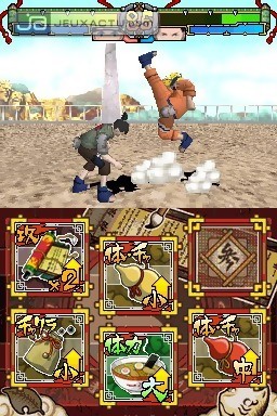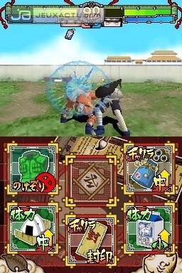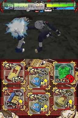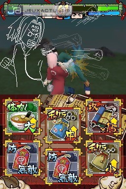 Takara Tomy nous avait promis une réplique quasi parfaite du gameplay des épisodes de Naruto Gekito Ninja Taisen! sur GameCube mais il semblerait que l’éditeur se soit quelque peu laissé emporter par sa joie. Pourtant, les ressemblances avec ce dernier sont là, à commencer par une liste de combos assez proche de son aîné sur GameCube. Les possibilités sont certes assez nombreuses mais l’enchevêtrement de ces attaques manque singulièrement de punch. Est-ce le temps de latence des coups portés à l’écran ou les bruitages quasi inexistants qui sont la cause de cette absence de vélocité dans les combats ? Certainement un peu des deux et ce n’est pas le faible nombre de furie par personnage ni leur mise en scène tout bonnement inexistante qui pourra rehausser un niveau, déjà bien au ras des pâquerettes. On aurait alors pu se tourner du côté des fonctionnalités tactiles de la DS pour varier les plaisirs mais activer quelques items pendant un combat n’a finalement rien d’excitant. L'effet est même néfaste puisque l’utilisation de ces bonus casse quelque peu le rythme déjà bien mou des affrontements. En effet, chaque protagoniste débute un match avec un nombre bien défini d’items, à utiliser librement lors des différents rounds. Chaque bonus se caractérise par leurs effets plus ou moins efficace comme la gourde de soin qui permet par exemple de gonfler à bloc sa jauge de vie, tandis que la brioche de riz permet de retrouver un peu de santé. De la même manière, il est possible d’enfiler une armure afin de se protéger des attaques que l’on soit en garde ou pas. A l’inverse, d’autres bonus offrent la possibilité d’accroître ses attaques et d’engendrer davantage de dégâts lors des coups portés à l’adversaire. Des bonus censés apporter un brin de technicité dans le gameplay, mais leur utilité ne fait que plomber davantage les combats. Que reste-t-il à ce Naruto : Ninja Destiny pour tenter de se rattraper ? Pas grand chose, d’autant que la réalisation du titre fait également pâle figure. Des personnages modélisés au taille-crayons, des textures baveuses, des couleurs bien ternes et des décors quasi vides, la DS nous avait habitué à bien mieux, même si sa grande qualité n’est pas de briller en 3D. Aïe, aïe, aïe…