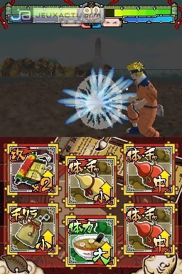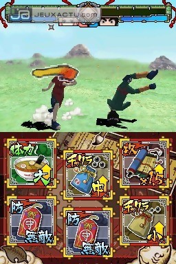Takara Tomy nous avait promis une réplique quasi parfaite du gameplay des épisodes de Naruto Gekito Ninja Taisen! sur GameCube mais il semblerait que l’éditeur se soit quelque peu laissé emporter par sa joie. Pourtant, les ressemblances avec ce dernier sont là, à commencer par une liste de combos assez proche de son aîné sur GameCube. Les possibilités sont certes assez nombreuses mais l’enchevêtrement de ces attaques manque singulièrement de punch. Est-ce le temps de latence des coups portés à l’écran ou les bruitages quasi inexistants qui sont la cause de cette absence de vélocité dans les combats ? Certainement un peu des deux et ce n’est pas le faible nombre de furie par personnage ni leur mise en scène tout bonnement inexistante qui pourra rehausser un niveau, déjà bien au ras des pâquerettes. On aurait alors pu se tourner du côté des fonctionnalités tactiles de la DS pour varier les plaisirs mais activer quelques items pendant un combat n’a finalement rien d’excitant. L'effet est même néfaste puisque l’utilisation de ces bonus casse quelque peu le rythme déjà bien mou des affrontements. En effet, chaque protagoniste débute un match avec un nombre bien défini d’items, à utiliser librement lors des différents rounds. Chaque bonus se caractérise par leurs effets plus ou moins efficace comme la gourde de soin qui permet par exemple de gonfler à bloc sa jauge de vie, tandis que la brioche de riz permet de retrouver un peu de santé. De la même manière, il est possible d’enfiler une armure afin de se protéger des attaques que l’on soit en garde ou pas. A l’inverse, d’autres bonus offrent la possibilité d’accroître ses attaques et d’engendrer davantage de dégâts lors des coups portés à l’adversaire. Des bonus censés apporter un brin de technicité dans le gameplay, mais leur utilité ne fait que plomber davantage les combats. Que reste-t-il à ce Naruto : Ninja Destiny pour tenter de se rattraper ? Pas grand chose, d’autant que la réalisation du titre fait également pâle figure. Des personnages modélisés au taille-crayons, des textures baveuses, des couleurs bien ternes et des décors quasi vides, la DS nous avait habitué à bien mieux, même si sa grande qualité n’est pas de briller en 3D. Aïe, aïe, aïe…