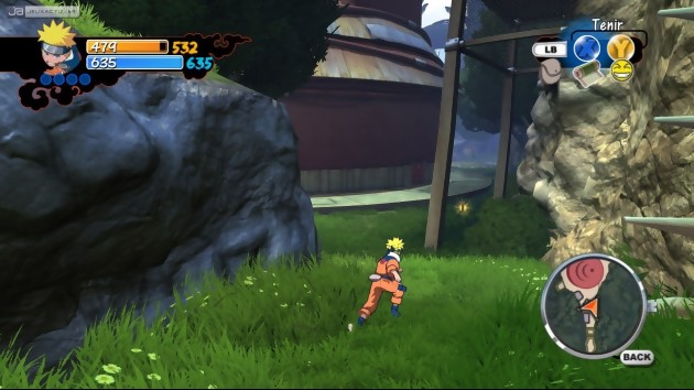 Inutile de tourner autour du pot et crevons l’abcès fissa : Naruto 360 est une belle déception. Fan absolu ou pas des aventures du trublion de Konoha, il est difficile de sortir satisfait de cette expérience nouvelle génération, tant les attentes étaient importantes et les erreurs de game design abondantes. Pourtant, tout avait bien commencé, avec notamment une première présentation exclusive que nous vous avions offerte au mois de mai dernier et qui présageait du meilleur. C’est d’autant plus regrettable car le jeu semblait à l’époque posséder toutes les bonnes cartes en mains pour réaliser un tel exploit. Visuellement tout d’abord, Naruto : Rise of a Ninja est un régal pour les yeux. Mélange de cel-shading et de 3D classique, le titre développé par Ubisoft Montréal peut se targuer d’être le plus beau jeu estampillé Naruto du moment. Pour obtenir un tel galon, les graphistes chez Ubi Montréal ont pris le soin de scruter les moindres détails du manga et du dessin animé, afin de ne pas froisser l’exigence extrême mais compréhensive des aficionados. Le village de Konoha, d’une superficie respectable, est modélisé avec grand soin, et ceux qui ont l’œil aguerri reconnaîtront sans le moindre effort les lieux les plus connus et exposés du village caché des feuilles, même si dans l’absolu la moitié de la commune a été imaginée faute de plans précis. Mais qu’importe, d’autres éléments permettent au joueur de se plonger pleinement dans l’ambiance et d’avoir le sentiment de véritablement parcourir les allées du village au gré des musiques originales. Petit bémol en revanche en ce qui concerne les voix japonaises, absentes de cette version mais qui devraient être disponibles d’ici quelques jours en téléchargement gratuit sur le Xbox Live. Preuve comme quoi le jeu est sorti précipitamment. Car, on a beau s’extasier devant la beauté du jeu, Naruto : Rise of a Ninja affiche ses défauts et ses limites dès la seconde heure de jeu. Aïe !