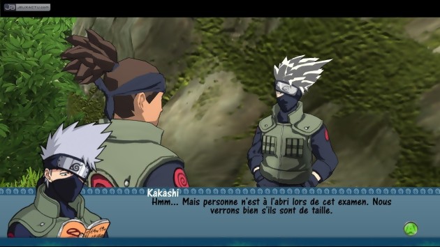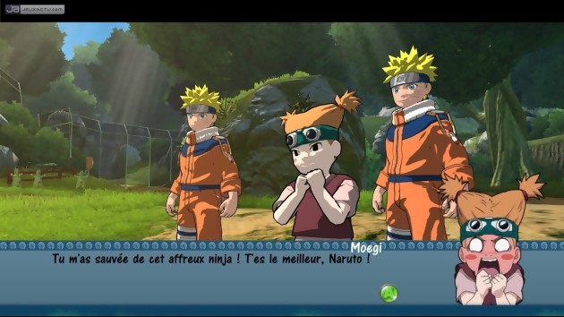 A l’instar de la série Gekito Ninja Taisen de 8ing et Tomy, les affrontements dans le jeu se déroulent dans une arène fermée où le vainqueur est déclaré après deux manches gagnantes. Bien entendu, on retrouve l’ensemble des protagonistes présents dans cette première saison, et tous possèdent une palette de mouvements spécifiques. Seulement voilà, une fois tous les combos maîtrisés et les jutsus acquis, on se rend rapidement compte que le jeu manque sérieusement de profondeur. La variété des attaques, premier leitmotiv d’un jeu de baston qui se respecte, est ici totalement absent, si bien qu’on se retrouve à réaliser les mêmes enchaînements sans le moindre challenge. Ceux qui pensent se rattraper sur les furies peuvent cesser immédiatement de fantasmer, puisqu’il n’existe qu’un seul jutsu par personnage. Un comble quand on sait que la concurrence mise sur la surenchère. Pire encore, la manière dont se réalise les jutsus risquent d’en énerver plus d’un, tant la méthode employée ne s’adapte pas du tout au système global. En effet, les développeurs ont eu la mauvaise idée de reprendre la même méthode de concentration de chakra à réaliser à l’aide des sticks analogiques. Histoire de complexifier encore plus la tâche, trois seuils différents - correspondant à la puissance de l’attaque – peuvent être atteints selon la concentration de la technique. Autant vous dire que dans un véritable combat, il est quasiment impossible de déclencher ces attaques, sans être à la portée des coups de l’adversaire qui nous empêchera systématiquement de lancer ces grosses attaques. Au cas où le challenge soit trop corsé, les développeurs ont intégré un système de rattrapages, baptisé ici MémoClip. Il s’agit d’une option à récolter au gré des conversations et des missions réussies, offrant une seconde chance pour battre son opposant. Evidemment, ce genre d’astuces ne fait que réduire la difficulté déjà trop facile du jeu. A trop vouloir jouer la carte de l’originalité, Ubisoft Montréal a perdu de vue l’essentiel, à savoir proposer un système simple et rapide à exécuter. C’est d’autant plus regrettable car les QTE lors des jutsus sont plutôt originaux et sympas à enchaîner. Tant pis.