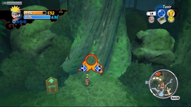 Vendu comme un GTA-like avec ses nombreuses missions principales et annexes à enchaîner, Naruto : Rise of a Ninja est avant tout l’histoire de Naruto, ce jeune gaillard parti de rien et dont le rêve absolu est de devenir un jour le Hokage de Konoha. Calé à l’actualité et aux épisodes qui sont en ce moment diffusés en France sur de nombreuses chaînes câblées et hertziennes, le mode "Aventure" couvre ainsi les 80 premiers épisodes de la série, des débuts de Naruto à l’académie des ninjas jusqu’au combat qui l’opposa à Gaara, juste après le tournoi des Jounins. L’histoire avance donc en fonction des missions réalisées tout au long de l’aventure. Afin de se repérer dans les nombreuses allées du village, le joueur peut compter sur un petit radar situé en bas à droit de l’écran mais aussi sur plusieurs éléments visuels apparaissant à l’écran. Naruto peut en effet à tout moment converser avec n’importe quel PNJ du village. Le pictogramme qui apparaît au-dessus de la tête de chaque villageois permet de savoir d’un simple coup d’œil si untel est apte ou pas à répondre aux questions. Chaque mission, qu’elle soit principale ou facultative, est indiquée sur la carte par un rouleau et correspond systématiquement à un villageois ou un ninja. Bien évidemment, l’aventure débute par des missions assez basiques et sans grand intérêt, mais permettent de se faire la main sur les différents mécanismes de jeu. Etant un jeune apprenti-ninja au départ, Naruto va donc devoir passer par la case entraînement avant de pouvoir acquérir l’ensemble de ses facultés physiques et ses jutsus (techniques). A l’aide d’Iruka Sensei puis de Kakashi Sensei, notre ninja blond va donc apprendre la technique du clonage, celui du sexy jutsu, le double saut mais aussi à maîtriser son chakra, ce qui lui permettra de monter à la verticale sur les arbres et sur les murs et marcher sur l’eau. Une fois ces techniques acquises, notre héros pourra non seulement accéder aux niveaux supérieurs du village mais en outre quitter le village pour explorer de nouveaux horizons.