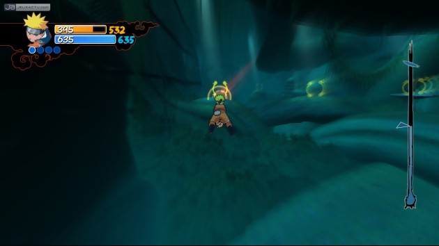 Ce manque de profondeur, on le retrouve également dans l’aventure. Très vite, on se rend compte que tout le jeu se repose sur des allers et venus constants entre le village de Konaha et les quelques espaces extérieurs où l’on ne fait que rencontrer les mêmes méchants aux mêmes endroits. Battre un bandit trois fois avant d’accéder à son lieutenant puis enfin au chef qu’il va falloir battre par deux fois, voilà le genre de missions que nous propose Naruto : Rise of a Ninja. Même les défis de sprint et les séquences de course dans les arbres, pourtant sympas de prime abord, se révèlent être lassants à force tant ils sont fréquents. Les missions annexes manquent elles aussi de variété puisque l’on se contente toujours des mêmes défis tout au long de l’aventure. Trouver des pièces, apporter des soupes de ramen à domicile, jouer à cache-cache avec Konohamaru, là encore, le manque de variété fait cruellement défaut au jeu. Pour palier à cette carence, Ubisoft a eu l’ingénieuse idée de ponctuer l’aventure de nombreuses vidéos repiquées du dessin animé afin que l’illusion soit parfaite. Malheureusement, le subterfuge ne fonctionne que le temps d’un tour de passe-passe digne de Sylvain Mirouf. Car balancer des passages du dessin animé que n’importe quel fan connaît sur le bout des doigts est une nouvelle erreur qu’un bon conseilleur aurait pu déceler pendant la production du jeu. Manque de temps ? Manque d’argent ? Peu importe les raisons, il aurait été plus sympathique de proposer davantage de cinématiques réalisées à partir du moteur du jeu. Pour conclure en apothéose, il faut savoir que Naruto : Rise of a Ninja se boucle entre 6 et