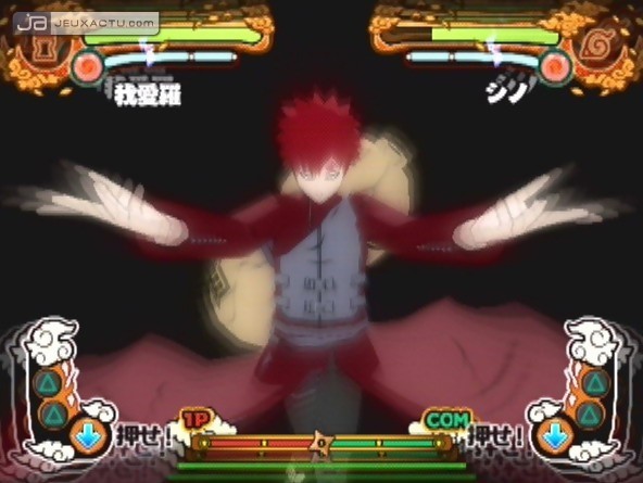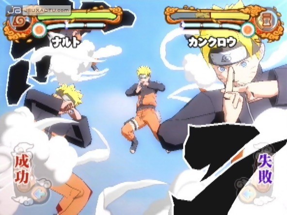 Mais en fouinant de manière plus profonde le jeu, on se rend compte qu’il existe quelques subtilités mais aussi quelques nouveautés que certains habitués du précédent volet risquent de bouder. Le système de Ougis, ces fameuses techniques permettant de déclencher les suprêmes attaques de chaque ninja et ainsi laisser place à des séquences animées de toute beauté et proche du dessin animé, a été revu et corrigé. Auparavant, chaque niveau de Ougi s’activait en fonction du nombre de fois qu’on appuyait sur la touche Triangle. Désormais, déclencher l’ultime attaque de son ninja préféré ne se fera pas aussi aisément. Chaque échelon s’active selon des critères bien précis pendant le match, ce qui devrait convenir aux techniciens de base lassés de voir le premier newbie sortir aussi aisément l’attaque suprême. Bien évidemment, pour réussir à maintenir cette furie tout le long, il faut reproduire le schéma qui apparaît en bas de l’écran, où le joueur doit appuyer sur les bonnes touches au bon moment sans se tromper, sous peine de ne pas infliger la maximum de dégâts possible. Cet aspect plus subtil est appuyé par l’introduction d’un système de Shi-Fu-Mi, en d’autres termes le célèbre Pierre-Papier-Ciseau. Ce dernier s’enclenche au moment où un adversaire parvient à contrer l’attaque d’un antagoniste avec une attaque similaire. Il faut alors appuyer de façon très rapide, quasi instinctive même, pour espérer remporter le duel.