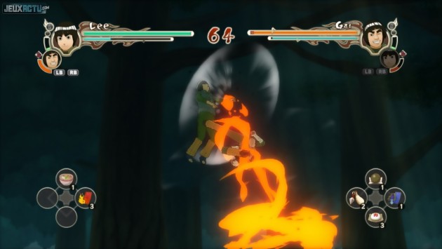De ce point de vue-là, CyberConnect2 a fait également étal de son savoir-faire acquis au fil des années. Sans surprise, le système de combat du premier Ultimate Ninja Storm a été conservé avec cette même accessibilité qui avait séduit le grand public. Une prise en main simple certes mais qui cache tout de même une certaine tacticité dans les manœuvres. On pense notamment à la technique de substitution (touche L1/R1 ou LB/RB) qui permet de disparaître après s’être mangé un premier coup et réapparaître dans le dos de son ennemi. Une action plutôt sympathique, permettant de se défaire d’un combo un peu trop persistant, à condition tout de même d’avoir une bonne réserve de chakra de disponible. Concentrer son énergie est d’ailleurs l’un des éléments à maîtriser lors des combats, car comme tout un chacun sait, c’est grâce à ce flux d’énergie qu’il est possible de lancer des attaques et pourquoi pas exécuter un Ougi, la furie locale. Si la manière de le réaliser n’a pas changé (on charge sa barre de chakra en appuyant plusieurs fois sur Triangle ou Y pour ensuite valider l’attaque avec Rond ou B), ce dernier s’est cette année dispensé de la série de touches à appuyer. Terminé donc les combinaisons à enchaîner le plus rapidement possible pour prendre l’ascendant sur l’adversaire, désormais une attaque enclenchée réussira quoiqu’il arrive. Tant mieux pour certains, scandale pour d’autres. Chacun voit en fait midi à sa porte. En revanche, ce qui fera entièrement l'unanimité, c'est l'intégration du mode "Eveil" qui permet à chacun des persos d'accéder à une autre performance physique. Une sorte de transformation de dernière minute, offrant des attaques plus puissantes et souvent conformes aux métamorphoses liées au manga. Ainsi, Naruto peut passer en mode Kyubi (4 et 8 queues), Sasuke faire appel à son Mangekyou Sharingan, Rock Lee et Gai ouvrir leurs portes internes, Jiraya passer en mode Sennin, etc. Une astuce qui peut renverser la vapeur lors d'un match un peu trop serré.