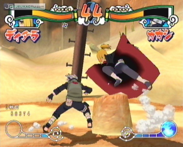 En revanche, 8ing a conservé les mécanismes principaux de jeu dans Naruto Shippuuden Gekito Ninja Taisen! EX, tout en apportant quelques subtilités bienvenues. Dorénavant, chacune des arènes, fermées de prime abord, abritent des éléments supplémentaires. Caisses, rochers, rondins de bois, ces objets à première vue sans intérêt offrent de nouvelles possibilités de gameplay aux personnages. Il est en effet désormais de se cacher derrière l’un de ces éléments pour éviter un shuriken ou une attaque, mais il est aussi possible de s’en servir d’appui pour se propulser dans les airs et passer de l’autre côté de son ennemi. Mieux, les arènes de combat qu’on pensait donc fermées cachent en réalité un second plan, à condition d’en forcer l’accès, soit sur les côtés, soit pas le bas, un peu de la même manière que dans un épisode de Dead or Alive. Pour y accéder, rien de plus simple, il suffit d’envoyer valdinguer son adversaire par un coup bien précis ou de fracasser le sol après plusieurs attaques. La transition entre les deux arènes s’illustre à l’écran par une cinématique pendant laquelle les joueurs ne sont pas seulement de simples spectateurs. Balancer un gnon supplémentaire ou esquiver ladite mandale, voilà donc les deux possibilités offertes aux joueurs, selon la position (offensive ou défensive) dans laquelle on se trouve.