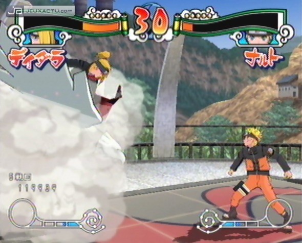 Visuellement tout d’abord, les nouvelles tenues vestimentaires de nos héros permettent d’intensifier ce sentiment de nouveauté. Ensuite, l’ensemble des coups spéciaux de chacun d’entre eux a également été revu et corrigé, ce qui procure un véritable plaisir supplémentaire. En effet, des personnages tels que Sakura, Tenten et Neji n’ont plus grand-chose à voir avec les anciens volets et s’accordent avec leurs évolutions techniques liées au manga et au dessin animé. Entraînée par Tsunade, Sakura possède désormais une force de frappe hallucinante, si bien que chacun de ses coups donnent l’impression de causer des dégâts sévères à l’adversaire. Une sensation de puissance renforcée dès lors qu’elle concentre son chakra à l’extrémité de ses poings. Tenten aussi n’est pas en reste et ses techniques de ninja lui assurent une grande variété d’armes blanches. Ainsi, elle est capable de permuter d’un sabre à une lance, en passant par le bâton ou bien encore la chaîne en un clin d’œil, réduisant ainsi les actions anticipées de l’adversaire. Quant aux autres personnages tels que Naruto, Gaara, Rock Lee ou bien encore Kankuro, ils se démarquent avant tout par de nouvelles furies, reprises bien évidemment du manga et qui devraient satisfaire tous les fans de l’œuvre de Masashi Kishimoto. A ce propos, il est utile de savoir que l’ensemble des 14 persos possèdent chacun deux furies, ce qui permet de varier les plaisirs.