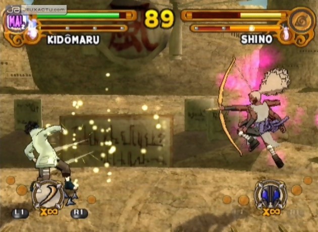 Oui, trois longues années, c’est le temps qu’il a fallu attendre pour que Bandai Namco Games daigne enfin livrer ce Naruto : Ultimate Ninja 3 sur le Vieux Continent. Toutefois, nul besoin de faire jaillir sa rancœur du fin fond de ses entrailles, les deux éditeurs se contentent simplement de caler la sortie du jeu à la diffusion du dessin dans l’Hexagone, même si Game One s’apprête d’ores et déjà à diffuser la nouvelle saison Shippuuden d’ici quelques jours. Toutefois, pour ceux qui suivent les nouvelles aventures de Naruto assidûment, la sortie de Naruto : Ultimate Ninja 3 est l’occasion de faire un petit bond dans le passé, à l’époque où Sasuke ne faisait pas le poids face à Orochimaru. Pas de surprise donc côté casting, on retrouve la plupart des protagonistes qui ont participé à la recherche active de Sasuke, pris dans les filets des sbires de l’infâme Orochimaru. Alors que l’épisode deux proposait un total de 32 personnages, Naruto : Ultimate Ninja 3 joue la carte de la surenchère et affiche pas moins de 40 ninjas ! Un chiffre assez impressionnant et qui permet maintenant de prendre le contrôle de persos inédits tels que Jirôbô, Kidômaru, Tayuya ou bien encore Kimimaro. Avec l’introduction des ninjas d’Oto no Kuni, le jeu gère désormais les transformations en temps réel. En réalisant – avec succès – certains jutsus, il est en effet possible de métamorphoser certains personnages qui garderont leur seconde forme pendant tout le restant du combat. Naruto, Sasuke, Jirôbô, Kidômaru, Tayuya, Kimimaro, et même Rock Lee, chacun d’entre eux dispose d’une nouvelle palette de coups et de jutsus une fois transformé. Toujours dans un souci d’authenticité, le studio CyberConnect2 a intégré des phases d’action aux commandes des Bijûs et des créatures invoquées par leurs maîtres telles que le crapaud de Jiraya, le serpent d’Orochimaru ou bien encore la limace de Tsunade. Evidemment, l’intégration de ces petits bonus permettent de rendre les combats encore plus dynamiques qu’ils l’étaient auparavant, même si un sentiment de déjà-vu plane au-dessus de Naruto : Ultimate Ninja 3.