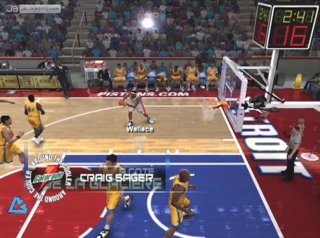 Et force est de constater que si NBA 2K6 pouvait être léger aux yeux des joueurs, NBA 2K7 met les deux pieds dans le plat de la nouvelle génération de consoles. Le moteur graphique a été nettement amélioré depuis la précédente version et même si on y retrouve les mêmes détails, on ne peut que tomber sous le charme des graphismes. Tout d’abord, les clones polygonés de nos athlètes sont toujours aussi impeccables sur le terrain. Ils se meuvent avec réalisme grâce à une motion capture bien rodée. Mais au-delà de leurs déplacements, ce sont les détails associés à chaque mouvement qui nous bluffent. Les shorts et les maillots bougent selon les changements de directions ou les sauts afin de rendre l’action encore plus crédible même si cette innovation avait son apparition dans NBA 2K6. Au même titre que les tenues vestimentaires, la transpiration apparente des basketteurs nous plonge encore plus dans ce show américain avec les gouttes qui ruissèlent sur les corps et les reflets des lumières sur la peau. On regrettera cependant que certaines modélisations faciales ne soient pas plus fidèles à la réalité, même pour certaines grandes stars de la profession. Mais il n’y a pas que les joueurs qui ont eu droit à ce lifting graphique, le public en a pris également pour son grade, la sueur en moins. Souvent mal modélisé dans les jeux de sports, ici il est recrée en 3D intégrale et les spectateurs réagissent en fonction des actions et de l’intensité du match pour une ambiance ô combien jouissive. Et quand, ce ne sont pas eux qui assurent le spectacle, ce sont les mascottes, les pom-pom-girls, les angles de caméras ou les commentateurs anglais qui s’en occupent. Compte tenu du résultat et malgré un léger aliasing entourant les bonshommes, on se demande à quoi ressemblera l’opus 2K8 l’année prochaine.