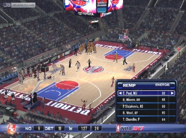 Et force est de constater que si NBA 2K6 pouvait être léger aux yeux des joueurs, NBA 2K7 met les deux pieds dans le plat de la nouvelle génération de consoles. Le moteur graphique a été nettement amélioré depuis la précédente version et même si on y retrouve les mêmes détails, on ne peut que tomber sous le charme des graphismes. Tout d’abord, les clones polygonés de nos athlètes sont toujours aussi impeccables sur le terrain. Ils se meuvent avec réalisme grâce à une motion capture bien rodée. Mais au-delà de leurs déplacements, ce sont les détails associés à chaque mouvement qui nous bluffent. Les shorts et les maillots bougent selon les changements de directions ou les sauts afin de rendre l’action encore plus crédible même si cette innovation avait son apparition dans NBA 2K6. Au même titre que les tenues vestimentaires, la transpiration apparente des basketteurs nous plonge encore plus dans ce show américain avec les gouttes qui ruissèlent sur les corps et les reflets des lumières sur la peau. On regrettera cependant que certaines modélisations faciales ne soient pas plus fidèles à la réalité, même pour certaines grandes stars de la profession. Mais il n’y a pas que les joueurs qui ont eu droit à ce lifting graphique, le public en a pris également pour son grade, la sueur en moins. Souvent mal modélisé dans les jeux de sports, ici il est recrée en 3D intégrale et les spectateurs réagissent en fonction des actions et de l’intensité du match pour une ambiance ô combien jouissive. Et quand, ce ne sont pas eux qui assurent le spectacle, ce sont les mascottes, les pom-pom-girls, les angles de caméras ou les commentateurs anglais qui s’en occupent. Compte tenu du résultat et malgré un léger aliasing entourant les bonshommes, on se demande à quoi ressemblera l’opus 2K8 l’année prochaine.