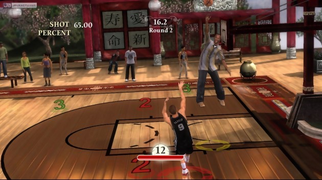 Oui, il est possible de claquer des dunks de quarante mètres de hauteur dans NBA Ballers : Chosen One, pour peu que l'on n'ait pas le vertige. Mais avant de défier les lois de la physique sur le bitume, on constate que les modes de jeu se comptent sur les doigts d'une main. Le mode "Story", qui est censé représenter l'essentiel du titre avec pas moins de six épisodes divisés chacun en cinq chapitres, se révèle assez quelconque, même si la possibilité de sculpter son propre avatar a toujours du charme. Si on s'est interdit de comparer NBA Ballers : Chosen One et NBA 2K8, il faut par contre admettre que Midway manque cruellement d'imagination en termes de création ; bien que des paramètres supplémentaires s'ajoutent au fur et à mesure que l'on progresse dans le jeu. Disons que le minimum syndical a été assuré, puisque l'on pourra répartir selon ses propres goûts des points d'expérience - ou de compétence - pour tailler son élève à son image. Si l'on préfère les meneurs véloces et percutants - Manu Ginobili, Tony Parker - au sein de la rédaction, on peut tout aussi bien créer un ailier féroce dans la raquette, ou bien encore un pivot prêt à croquer les doigts de celui qui s'approche de son panier. Naturellement, le profil du joueur évolue au fil des rencontres tout au long de son parcours professionnel, ce qui prétexte la présence d'un certain nombre de défis à relever, que ce soit en 1 vs. 1, ou 2 vs. 2. Exécuter un mouvement particulier, marquer un nombre de points précis, recoller au score avec un handicap plus ou moins important. Si ces pseudo-missions s'avèrent intéressantes au départ, elles deviennent rapidement rébarbatives par la suite, la faute à un manque cruel de variété dans le contenu, ce qui est fatal dans ce type d'exercice. Le mode Story, c'est aussi l'occasion de croiser la route de certaines gloires qui squattent actuellement les parquets de la NBA. Tim Duncan, Tony Parker, Lebron James, Kobe Bryant, Dwight Howard, tous sont au rendez-vous. Pour les fins limiers du basket-ball américain, quelques légendes sont également présentes dans NBA Ballers : Chosen One, comme Larry Bird qui a marqué de son empreinte les Celtics de Boston. Un mode Online, dans lequel on peut reprendre son propre avatar, est disponible, avec la possibilité d'organiser des matches officiel pour améliorer son classement, et espérer devenir l'Elu du streetball. En attendant, il va falloir s'habituer aux commandes de NBA Ballers : Chosen One qui, on le concède, ne facilitent pas la prise en main. Plus concrètement, il s'agit de réaliser des combinaisons complexes aussi bien avec les boutons de façade que de tranche, que l'on soit en phase offensive ou défensive. En pressant LB et X, on actionne un quick time event aussi intolérent que Mademoiselle Mangin. Plus sérieusement, la moindre hésitation - même de quelques millisecondes - annule la séquence, ce qui frustre plus qu'autre chose. Si l'opération réussit, on parvient à chiper le ballon à l'adversaire ou bien alors à claquer un dunk au-dessus de sa tête. Pour finir sur une note artistique, avouons que NBA Ballers : Chosen One est loin d'être moche, et ne ralentit même pas. Les terrains de jeu nous font découvrir des endroits tantôt atypiques, tantôt exotiques pour une partie de basket-ball, ce qui permet de se détacher le temps de quelques heures du sérieux de la NBA.