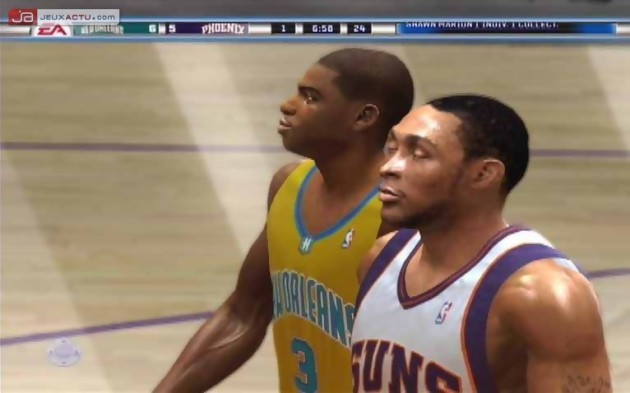 Les apparences sont trompeuses. Alors qu’on pensait – à raison – que la version Xbox 360 de NBA Live 06 ne serait qu’une pâle copie des versions sorties sur les autres supports, Electronic Arts nous surprend à deux reprises. Tout d’abord, d’un point de vue graphique, nous avons affaire ici à un tout autre jeu. Terminé les sportifs modélisés au scalpel, les développeurs ont abattu un travail de fourmi pour représenter les plus grands basketteurs de la NBA en 3D. Hormis quelques exceptions près, chaque faciès des joueurs est d’une ressemblance quasi parfaite. Les développeurs ont poussé le bouchon encore plus loin en jouant à fond la carte du détail. Les muscles des joueurs n’ont jamais été aussi saillant et en penchant le regard de plus près, il est possible de repérer des gouttes de sueur couler le long du visage mais aussi du corps de chaque joueur. Le résultat est assez bluffant et chaque plan rapproché nous permet d’apprécier le travail d’exception réalisé par Electronic Arts. Certes, on pourra toujours râler et dire que les personnages ne présentent aucune expression et qu’avec un peu de recul, ils donnent l’impression de ressembler à des poupées de cire, mais à l’heure actuelle, jamais ressemblance n’avait été aussi proche de la réalité. D’autant que l’animation des joueurs a été poussée à l’extrême, avec une motion capture encore plus saisissante. Le mode "Entrainement" en début de jeu est d’ailleurs le moment idéal pour se rendre compte qu’un cap a été franchi en matière de réalisation technique. Le public a lui aussi profité de la puissance de la Xbox 360 pour se faire valoir auprès du joueur puisqu’il est désormais entièrement en 3D. Des tribunes au loin jusqu’au premier rang, chaque individu qui compose ce public a été modélisé en 3D, ce qui lui permet d’être vivant car également fort réactif à la moindre action. Il se lève, applaudit, s’anime, bref on a réellement l’impression de figurer au sein d’un véritable stade. Impressionnant.