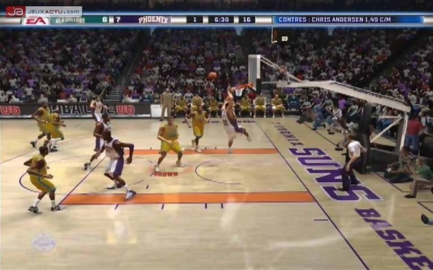 En effet, les joueurs sont désormais capables de réceptionner un ballon en pleine course sans marquer un temps d’arrêt, ce qui permet ainsi d’exercer des contre-attaques foudroyants. Les remises en jeu sont également plus dynamiques puisque l’on peut demander aux joueurs de se démarquer ou encore de faire écran. Si globalement, NBA Live 06 nécessite une certaine période d’acclimatation pour en profiter pleinement, une fois passé ce cap, pouvoir enchaîner les dunks à 180 degrés, tomahawks, alley-oop ou tout autre mouvement spectaculaire est vraiment jouissif. Les basketteurs dotés de ce genre d’habilités sont repérables par une icône qui permet également de connaître à quelle catégorie ils appartiennent (high flyer, meneur de jeu, marqueur, tireur, stoppeur ou homme fort). Une combinaison de deux touches au moment opportun permet alors d’exécuter les mouvements spéciaux. Par exemple, les hommes forts font la loi à l’intérieur de la raquette tandis que les stoppeurs mettront à mal les attaquants adverses. Une plutôt bonne idée, malheureusement fauché par une conversion réalisé en deux temps trois mouvements.