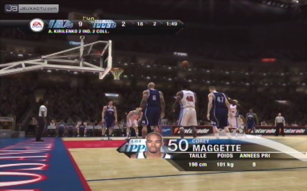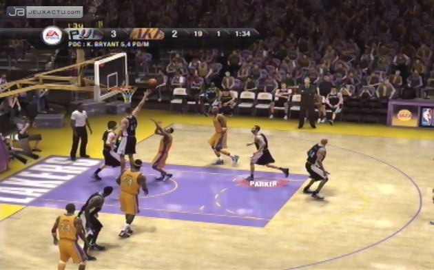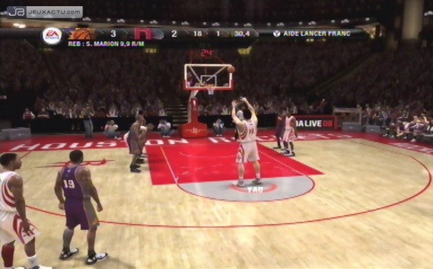 Dire que les fans de basket-ball sont restés sur leur faim l’année passée avec NBA Live 07 est un doux euphémisme. Après avoir été la risée de tous les playgrounds, la licence phare d’Electronic Arts avait une revanche à prendre, et pas seulement envers son concurrent de toujours, la série NBA 2K. Il en va de son honneur mais aussi de sa réputation. Bien décidés à se racheter une conduite, les développeurs d’EA Canada ont donc décidé de repartir du bon pied, afin de ne pas se faire trop distancer par la concurrence. Graphiquement tout d’abord, NBA Live 08 offre une réalisation bien plus soignée que celle du précédent volet. La modélisation des stars de la NBA n’est pas toujours parfaite – Tony Parker apparaît un peu bouffi dans le jeu, un comble pour celui qui est censé être l’icône de la licence – mais dans l’ensemble, le titre s’en tire plutôt bien. Certes, les maillots des joueurs ont la fâcheuse tendance à se balader un peu trop au gré des mouvements, mais les personnages semblent suffisamment naturels pour faire illusion. La présence d’un public en 3D (quelque peu cubique néanmoins), des animations dans tous les sens et les commentaires toujours aussi pertinents du duo Besnard / Eddy renforcent l’immersion, et permettent à NBA Live 08 de dégager une certaine ambiance, donnant l’impression d’assister à un véritable match de basket à la télé. Cela dit, on reste encore loin du résultat obtenu dans le dernier NBA 2K7 qui avait, il faut bien l’avouer, placer la barre assez haut.
