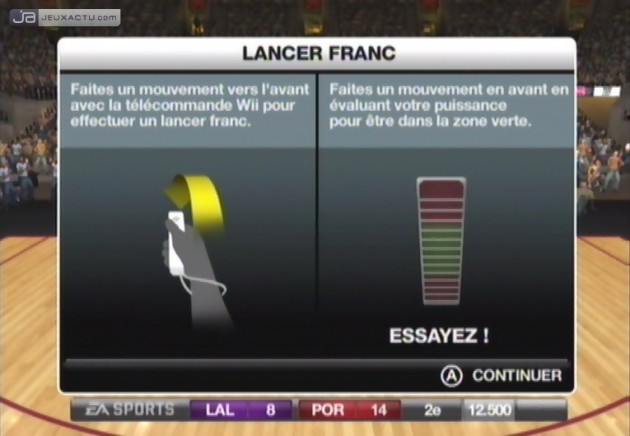 A l’instar de Table Tennis, le titre d’Electronic Arts propose deux types de configurations. La première appelée Commandes familiales se joue uniquement avec la Wiimote et consiste à se focaliser sur son jeu, à savoir les passes, les dribbles, les dunks et tout le reste des mouvements. Pour les déplacements, c’est l’ordinateur qui est maître de décision et il ne tient donc qu’à nous de composer avec ce qu’il a envie de faire. Si les passes se réalisent en appuyant sur la touche A, les mouvements de type dunk et autre lay-up se font en bougeant la Wiimote, soit du haut vers le bas, ou soit de la gauche vers la droite. Rien de plus complique sur le papier certes, mais le résultat à l’écran est d’un tout autre acabit, surtout quand on sait qu’il existe deux petites secondes de latence entre le geste du joueur et ce qui se passe à l’écran. C’est pourquoi, il est chaudement recommandé de choisir le type de commandes avancées, où l’entrée du Nunchuk permet de contrôler ses joueurs. C’est peut-être plus naturel mais ce n’est encore pas la bonne méthode pour que la Wii puisse enfin briller en dehors des jeux signés Nintendo. Si ce ratage complet fera rire toute la galerie, il est assez navrant de voir à quel point les développeurs ont méprisé, voire peut-être même saboté, leur travail tant le résultat est affligeant.