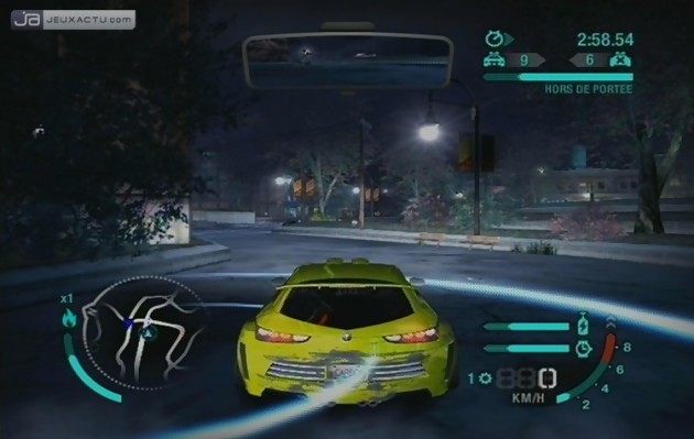 Le coup de pouce de Nikki, votre ex-girlfriend, est l’occasion de découvrir les nouvelles subtilités de jeu mises en place dans Need For Speed : Carbon. Fini les courses en solitaire, désormais vous pourrez recruter une équipe entière afin de vous épauler durant les challenges. Il y a trois classes de coéquipiers que vous embaucherez. Les premiers sont les Bloqueurs. Comme leur nom l’indique, leur boulot est d’entraver la bonne conduite de vos concurrents afin de vous laisser le champ libre ou alors de retarder leur avancée grâce à des block passings sournois. La deuxième catégorie de gusses est Aspiros. Ici, une bagnole se colle devant vous, vous faisant profiter de son aspiration. Si de prime abord, on n’a pas l’impression que de rester derrière le faisceau bleu de vos collègues vous fasse gagner de la vitesse, on remarque bien vite que cette technique s’avère cruciale lorsque vous êtes fasse à des adversaires remontés et à leurs bagnoles boostées. La troisième et dernière catégorie de pilotes se situe du côté des éclaireurs. Leur taff est de vous montrer la route à suivre pour semer vos adversaires en usant des raccourcis et des meilleures trajectoires possibles. A cela, il ne faut pas oublier que tous les membres de votre équipe, dont vous aurez au préalable renommé et modifié le logo, proposent des bonus de conduite. De simple gain d’argent supplémentaire aux accessoires à débloquer en passant par une réduction du taux de surveillance de la police, à vous de faire le bon choix. Si les Aspiros, les Bloqueurs et les Eclaireurs sont particulièrement efficaces, ils ne sont pas tout le temps à votre disposition. Il faudra remplir une jauge d’équipe avant de requérir leur aide en pressant Y. Une fois activée, elle diminuera au fil du temps ainsi un collègue qui ferme la marche perdra de précieuses secondes à remonter le peloton avant de pouvoir user de ses charmes. Vous pouvez néanmoins désactiver son aide à tout moment. S’ils sont super efficaces en course, ils peuvent être déstabilisants. Ainsi un bloqueur n’hésitera pas à vous couper sous le nez pour envoyer valdinguer votre adversaire ou un Aspiro freinera devant vous lorsque la jauge sera vide vous faisant perdre votre vitesse gagnée. Des soucis donc qui ont malheureusement leurs conséquences sur la course.