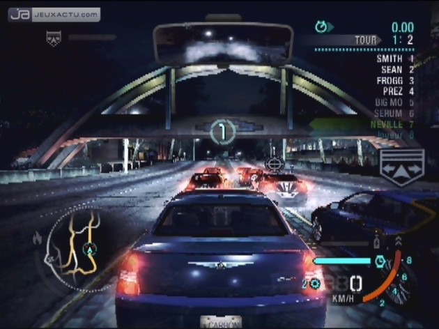 Mais cela n’empêche pas quelques petits désagréments de conduite comme des bagnoles un peu lourdes et surtout des objets qui se plantent devant votre capot et qui réduisent drastiquement votre vitesse. Vous avez beau faire des têtes à queues, il faudra attendre que la poubelle, le poteau ou le panneau de signalisation veuille bien dégager de votre champ de vision avant de retrouver votre accélération. Maintenant d’un point de vue technique, Need For Speed : Carbon est plutôt joli sans pour autant nous surprendre. Si le moteur graphique a gagné en effets depuis Need For Speed : Most Wanted, les développeurs se facilitent un peu trop la tâche en usant et abusant de l’effet de blur pour simuler la sensation de vitesse. Ça marche, mais ça lasse à la longue. Mais le premier problème du jeu sont ses soucis de frame-rate qui comme toujours fait des siennes et ralentit l’action pendant quelques secondes avant que l’ensemble ne retrouve son rythme de croisière.