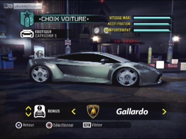 Ses péripéties sur le bitume l’ont poussé à se faire pas mal d’ennemis et le peu d’amis qui lui restent se compte sur les doigts d’une main. Parmi eux, il y a la belle Emmanuel Vaugier (Nikki) qui a perdu de son charme après son apparition dans le film The House of The Dead 2. Mais là n’est pas le débat. La miss en jupe courte lui propose d’entrée de jeu de choisir une bagnole pour remplacer sa BMW M3 cabossée. Exotic, Tuning ou Muscle, le choix est important car chaque catégorie de voitures a ses qualités et ses défauts. Tenue de route exemplaire, vitesse de pointe ahurissante ou dérapages maîtrisés, il faudra se décider. Néanmoins, cette sélection n’influera pas le reste du jeu car vous pourrez vous offrir à tout moment n’importe quel bolide Exotic, Tuning ou Muscle.